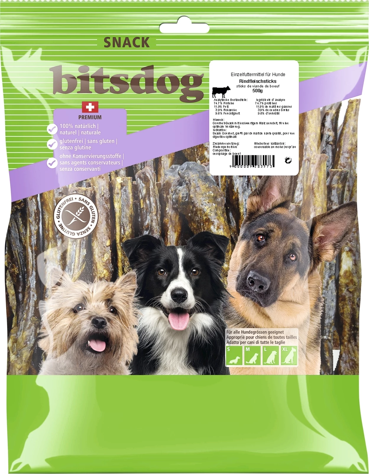 bitsdog. Ergänzungsfuttermittel aus Rind für jeden Hund. Ideal als Snack für Zwischendurch. Reich an Eiweiss. Ohne Konservierungsstoffe.