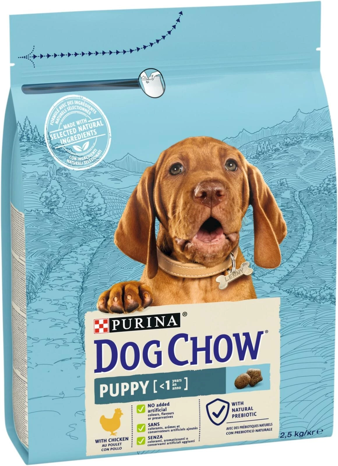 Das Alleinfuttermittel mit Geflügel von DogChow ist ausgewogenes Trockenfutter für alle Welpen, welches die Gesundheit unterstützt. Auch geeignet für trächtige, säugende und ausgewachsene Hunde kleinster Rassen. Es besteht aus Getreide (44 % Vollkorn), Fleisch, tierischen Nebenerzeugnissen (16 %), pflanzliche Eiweissextrakte, Öle und Fette, pflanzliche Nebenerzeugnisse, Gemüse (1,1 % getrocknete Chicorée Wurzel, 0,07 % getrocknete Karotten, 0,07 % getrockneter Spinat) und Mineralstoffe. Ein hoher Protein- und Fettgehalt hilft die Energiereserven des Welpen wiederherzustellen. Enthält Vitamin E, welches mit Antioxidantien zusammen frei Radikale bekämpft und somit die natürlichen Abwehrkräfte unterstützt. Der enthaltende Chicorée unterstützt die Verdauung und hilft die Darmgesundheit zu fördern.