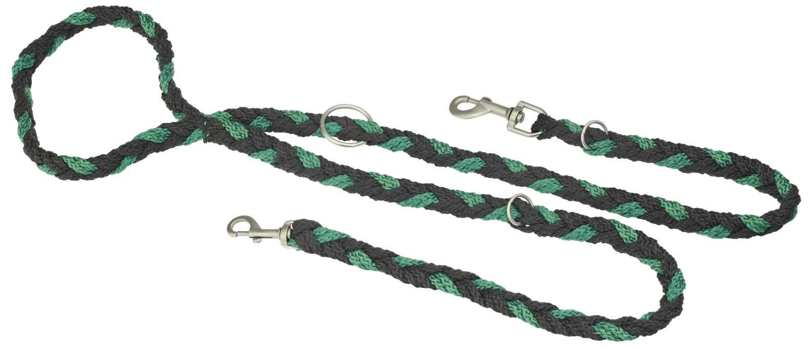 Die Hundeleine von bitsdog in den Farben Grün/Schwarz zeichnet sich durch das hochwertige und robuste Nylonmaterial aus. Geeignet ist die geflochtene Leine für alle Hunde. Es sind zwei Haken und drei Ringe zum Befestigen der Leine am Hundehalsband vorhanden. Die Gesamtlänge beträgt 2 Meter.