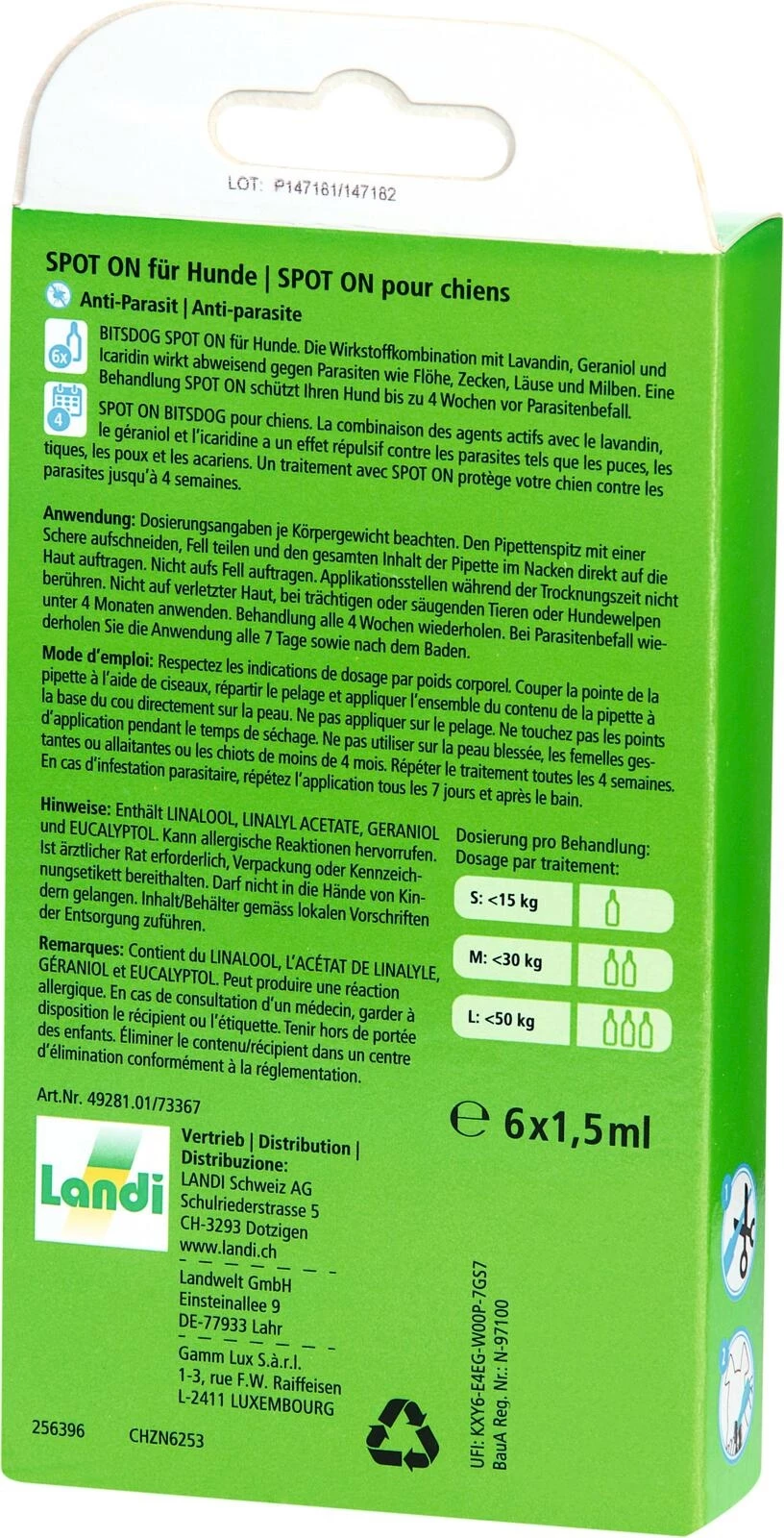 Die Spot on für Hunde von bitsdog schützt Ihren Hund bis zu 4 Wochen vor Parasitenbefall. Mit der Wirkstoffkombination von Lavandin, Geraniol und Icaridin wirkt dies abweisend gegen Parasiten wie Flöhe, Zecken, Läuse und Milben. Je nach Gewicht des Hundes, wird das Mittel anders dosiert: