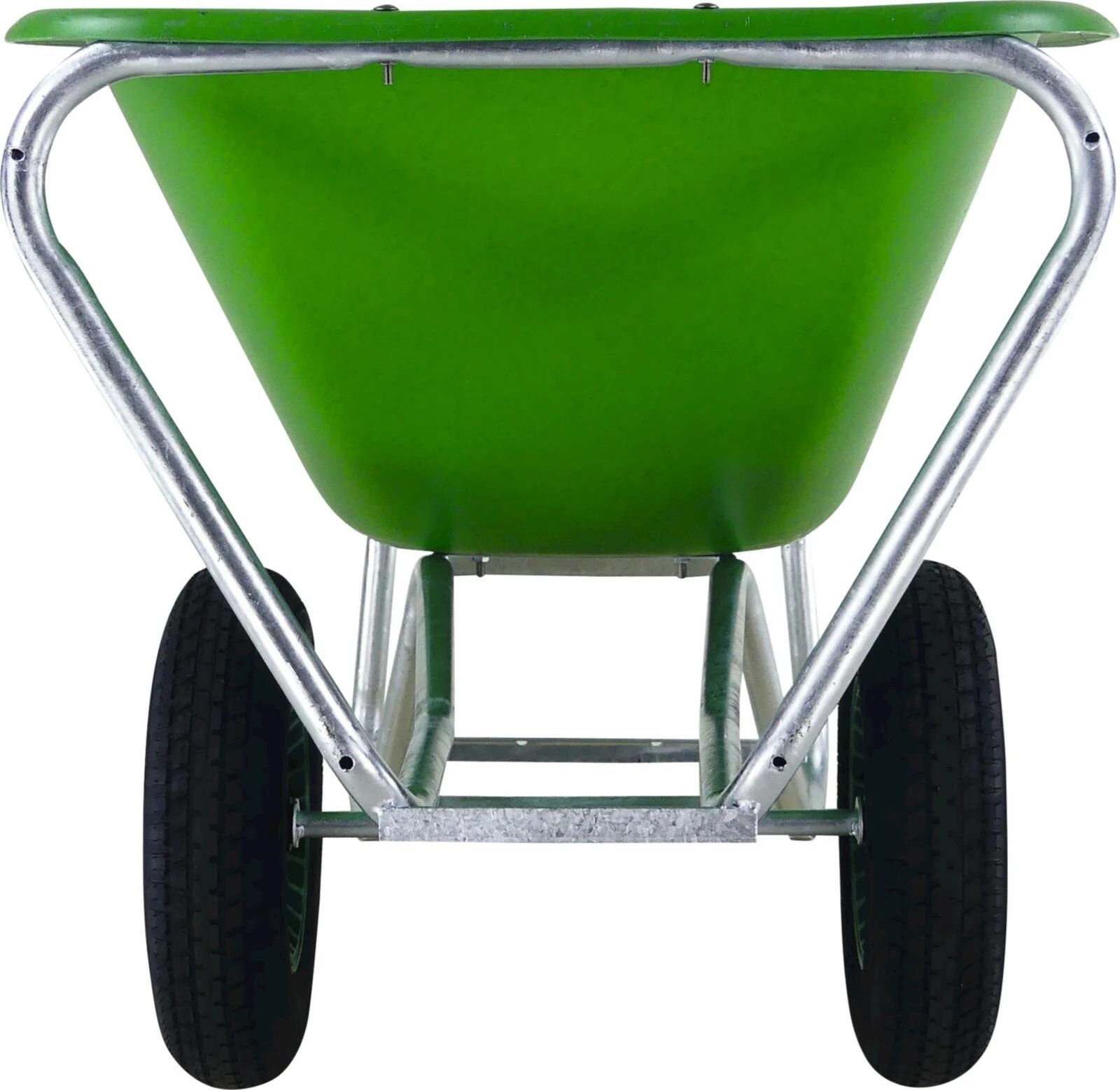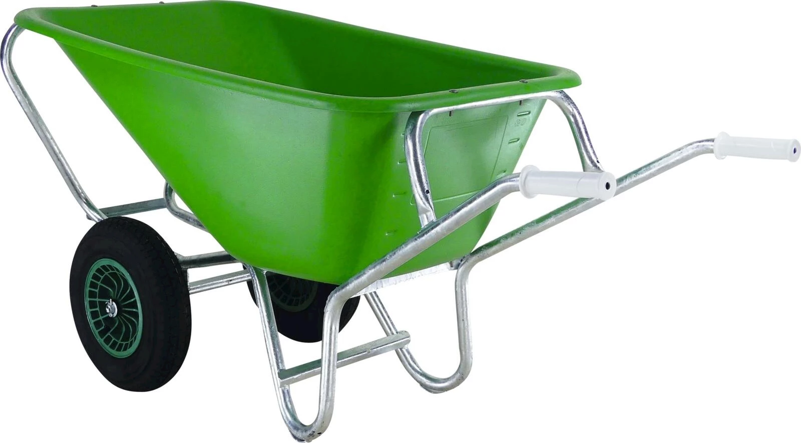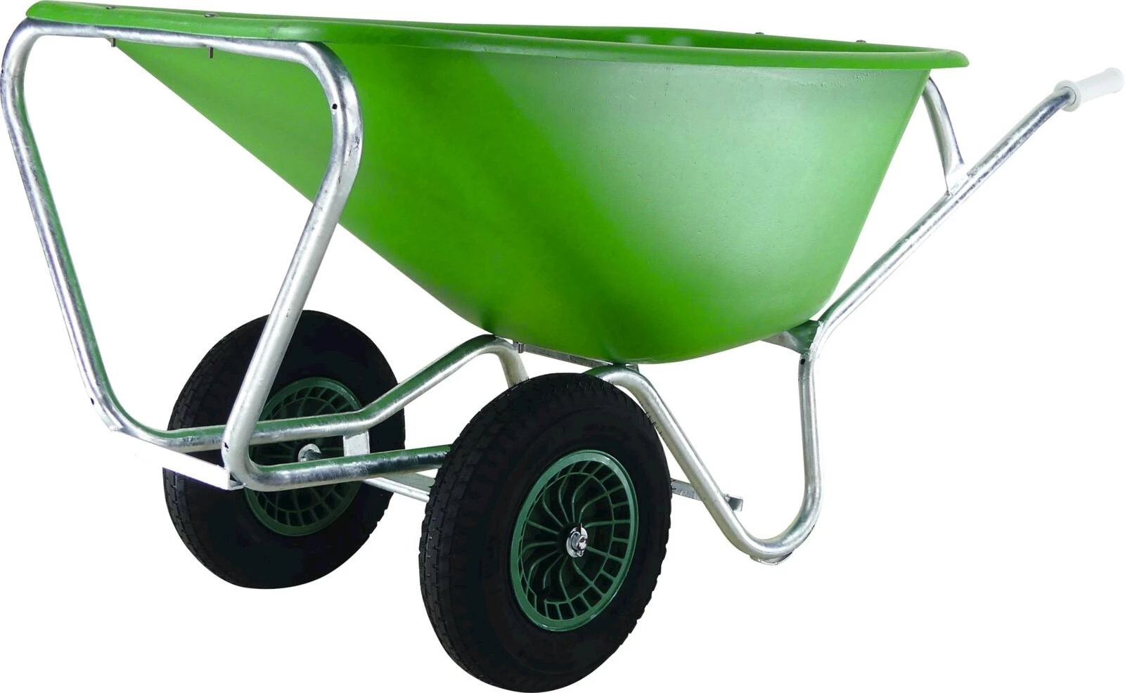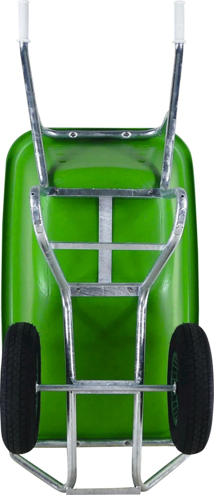 Ein Zweirad-Muldenkipper mit einer Kapazität von 165 Litern. Die Innenfläche ist vakuumgeformt und glatt. Der Rahmen ist verzinkt und besteht aus äusserst robustem HDPE-Kunststoff mit gleichmässiger Wandstärke.