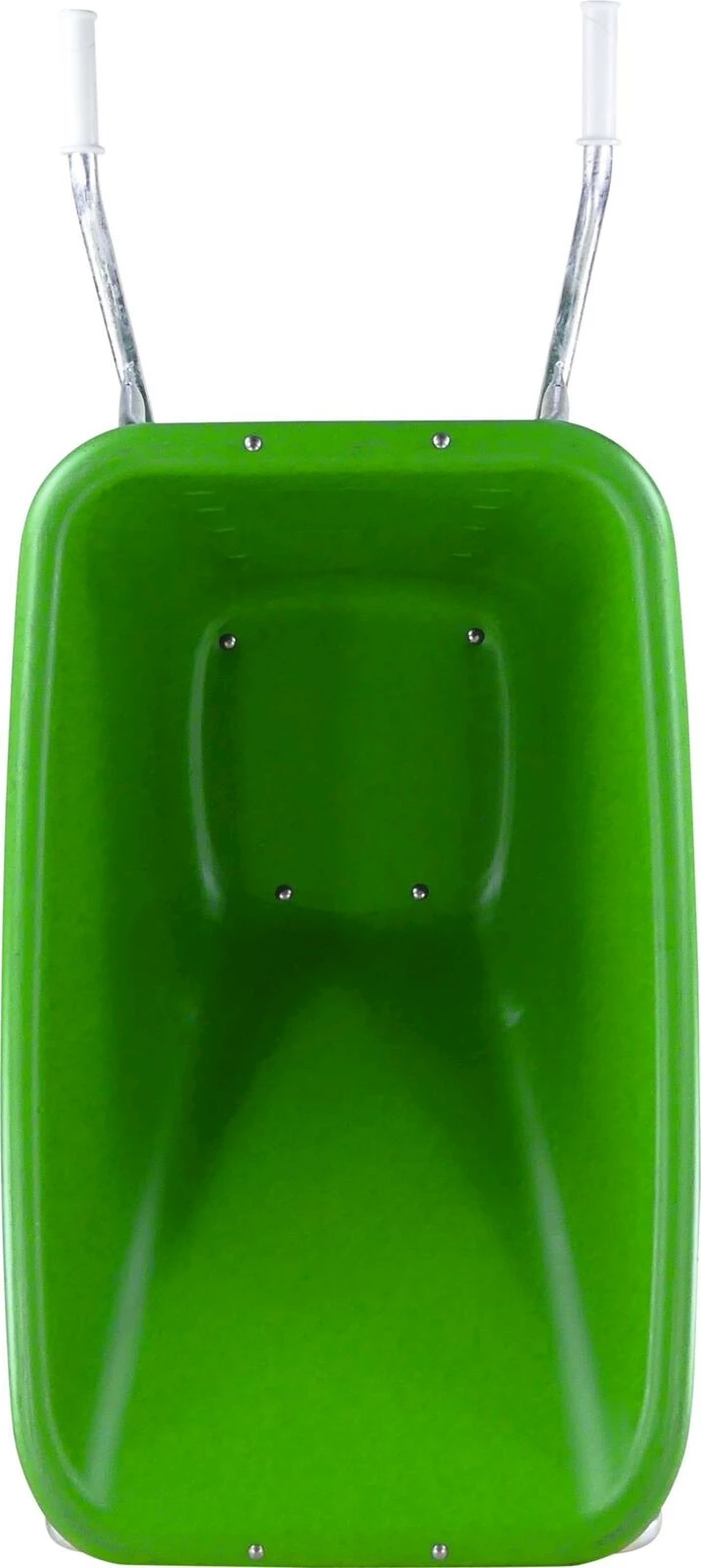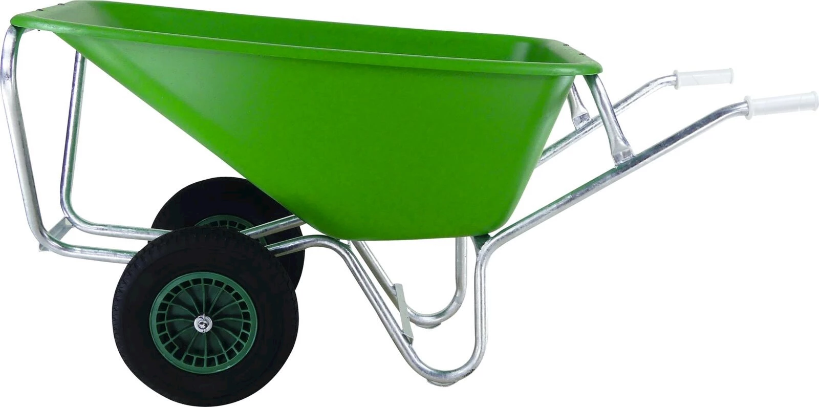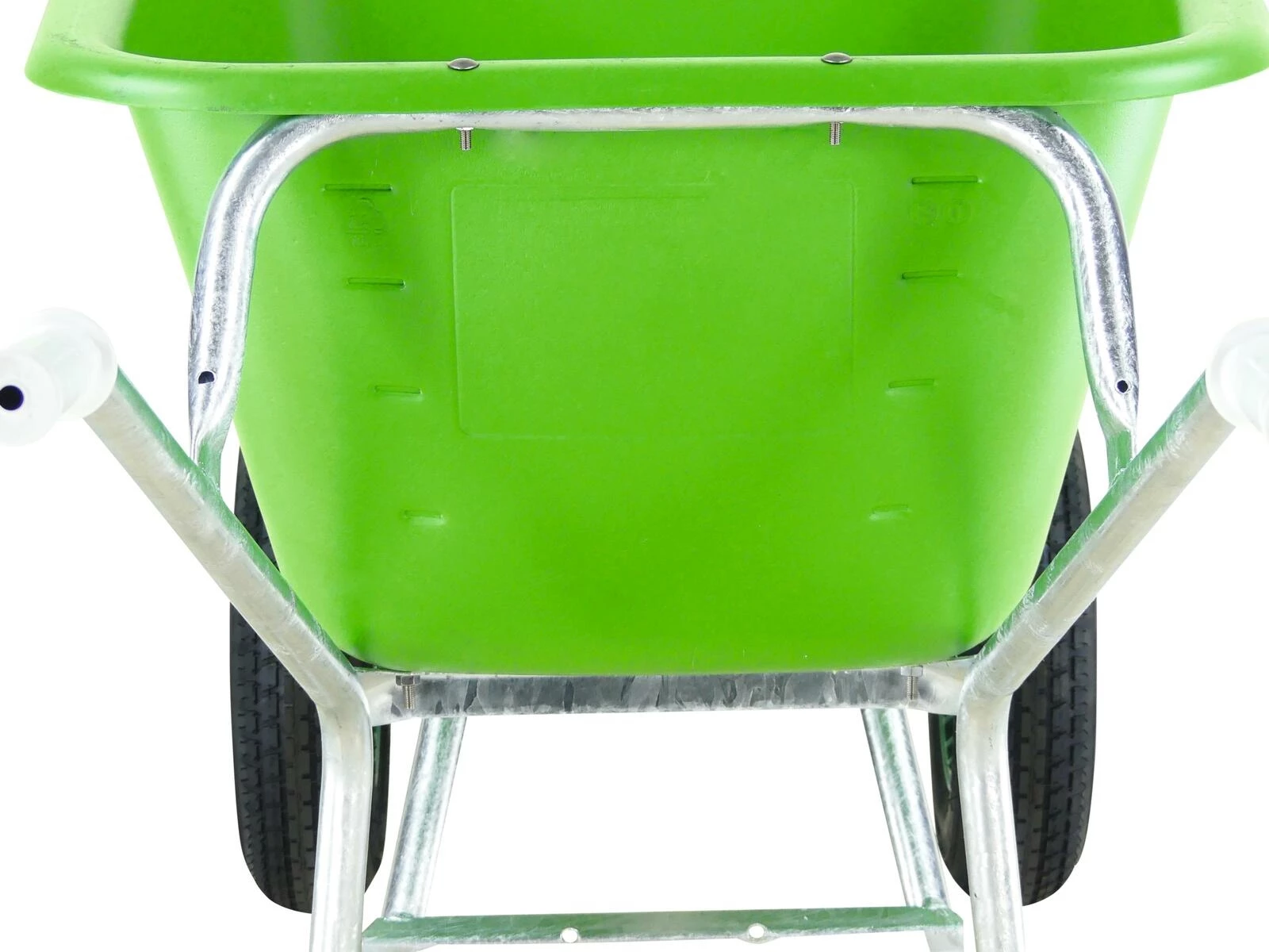 Ein Zweirad-Muldenkipper mit einer Kapazität von 165 Litern. Die Innenfläche ist vakuumgeformt und glatt. Der Rahmen ist verzinkt und besteht aus äusserst robustem HDPE-Kunststoff mit gleichmässiger Wandstärke.