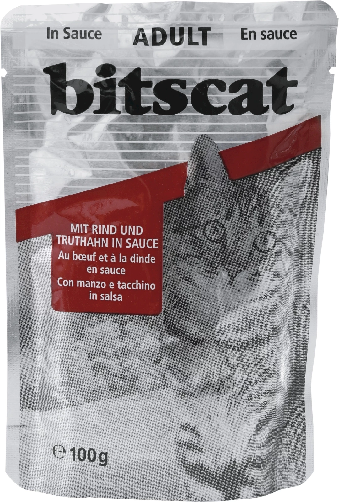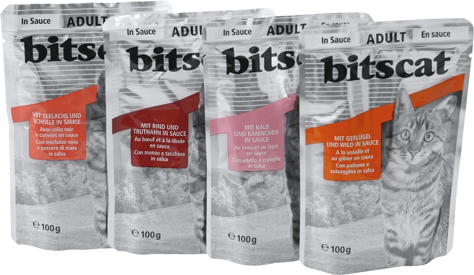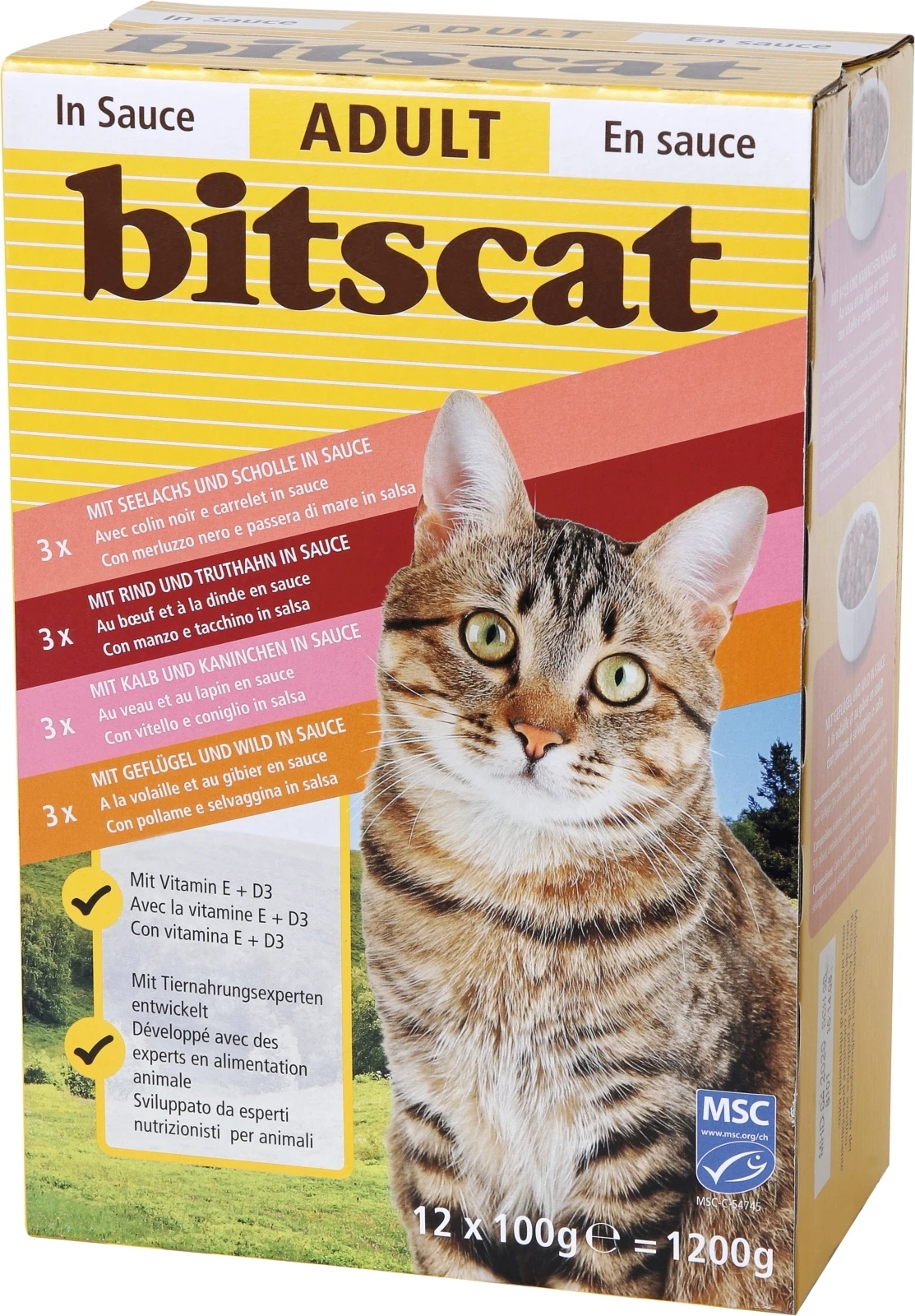 bitscat. Alleinfuttermittel für Katzen. Beinhaltet 3 Rind/Truthahn, 3 Geflügel/Wild, 3 Lachs/Forelle, 3 Kalb/Kaninchen. Ohne künstlichen Farb- und Aromastoffen.