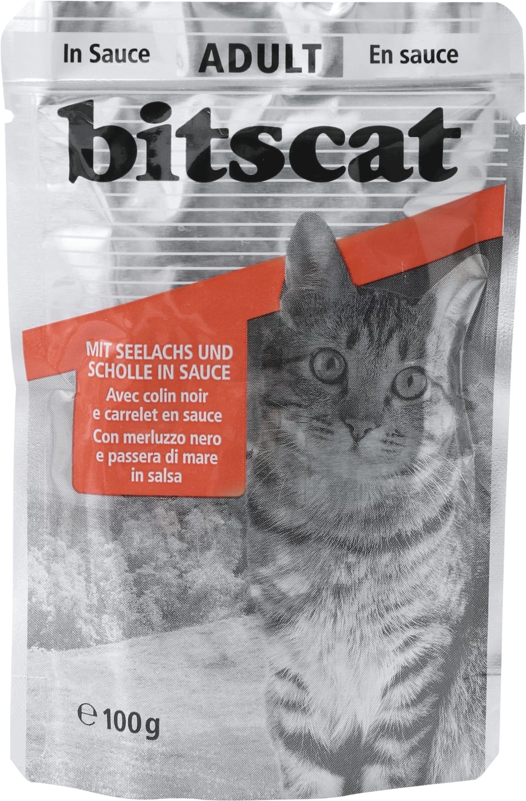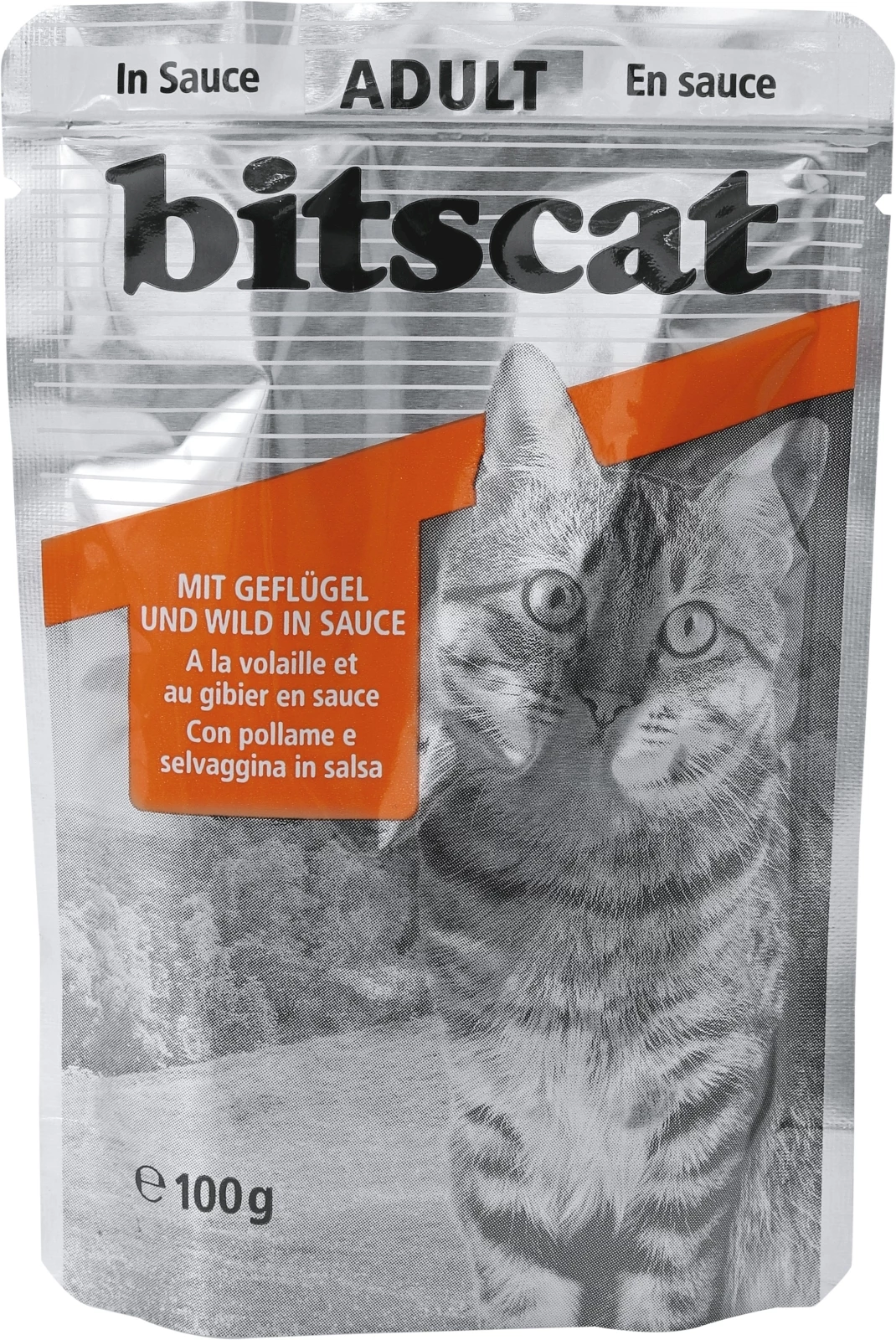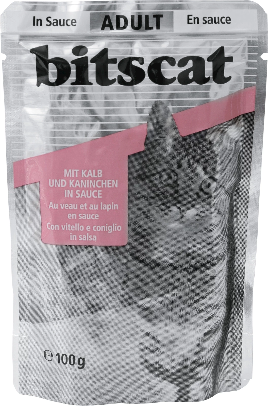 bitscat. Alleinfuttermittel für Katzen. Beinhaltet 3 Rind/Truthahn, 3 Geflügel/Wild, 3 Lachs/Forelle, 3 Kalb/Kaninchen. Ohne künstlichen Farb- und Aromastoffen.