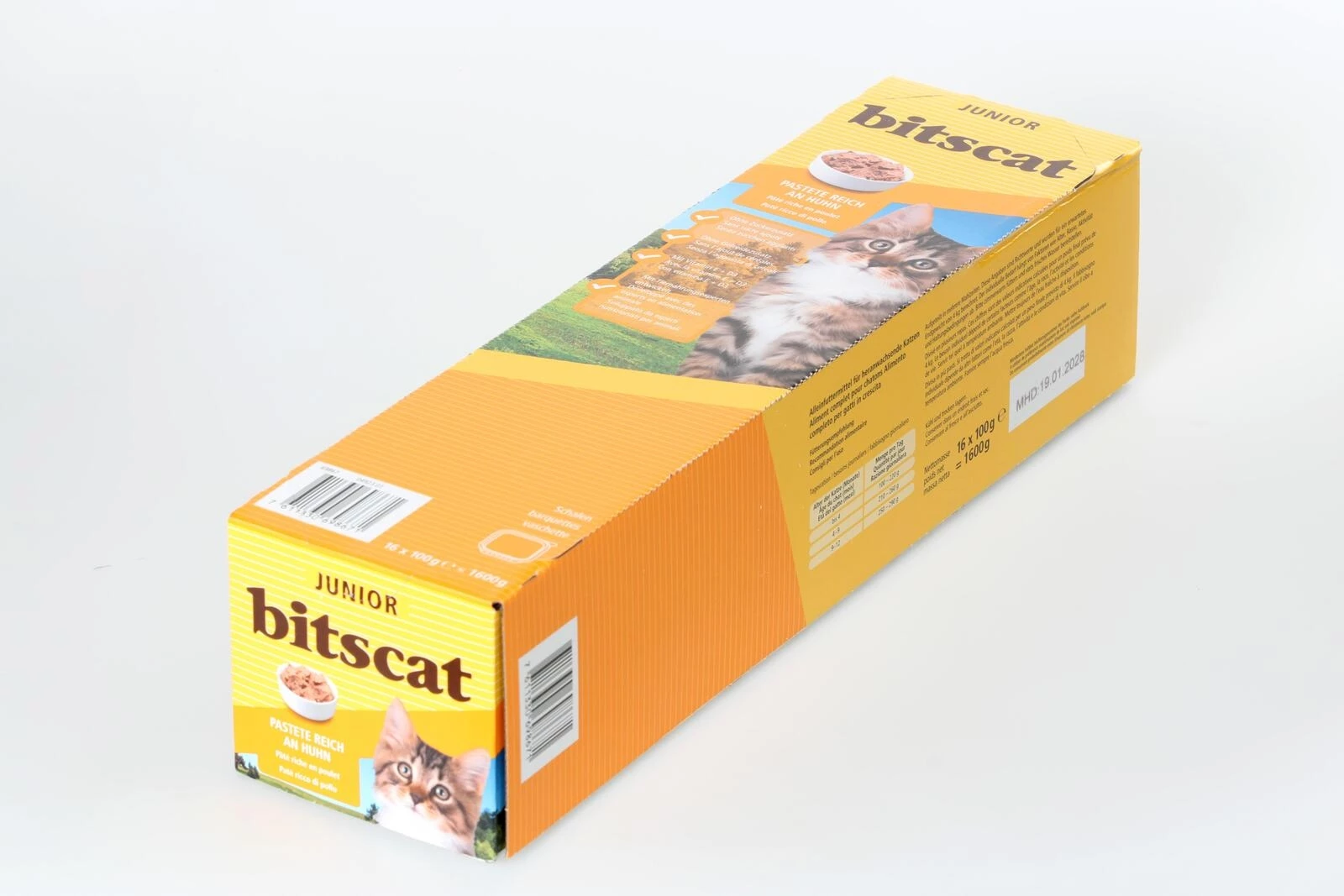 bitscat. Alleinfuttermittel für heranwachsende Katzen. Reich an Vitamin E und D3. Ohne Zusatz von Zucker, Getreide, Konservierungsmitteln, Farb- und Aromastoffen.