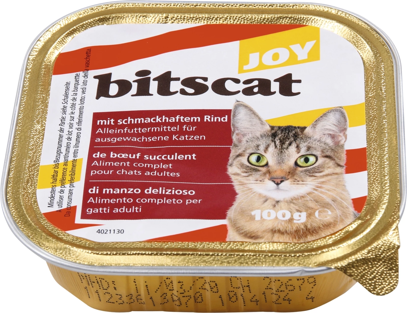 bitscat Joy. Alleinfuttermittel für ausgewachsene Katzen. Ohne Zusatz von Zucker, Konservierungsmittel, Antioxidationsmittel und Farbstoffen.