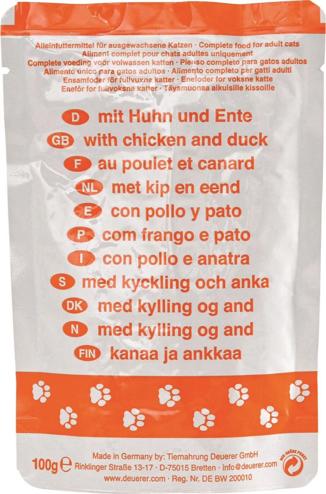 bitscat. Alleinfuttermittel für ältere Katzen ab 8 Jahren. Ohne Zusatz von künstlichen Farb- und Aromastoffen. Reich an Huhn und Ente in Sauce. Mit Vitamin E + D3.