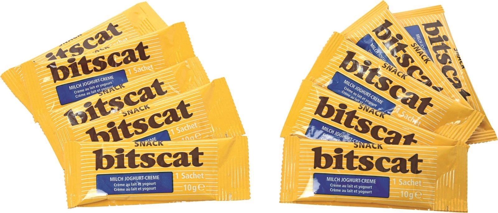 bitscat. Ergänzungsfuttermittel für ausgewachsene Katzen mit Calcium. Ohne Zusatz von künstlichen Farb- und Aromastoffen und Zucker.