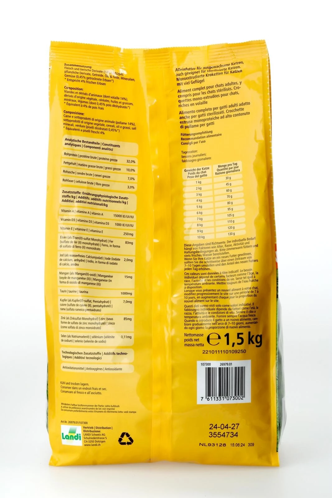 Das Katzentrockenfutter mit Geflügel wurde speziell für die Bedürfnisse ausgewachsener Katzen entwickelt, besonders für sensible Tiere mit Allergien und Unverträglichkeiten sowie für sterilisierte oder kastrierte Katzen. Die sorgfältig ausgewählte Rezeptur enthält Fleisch und tierische Derivate, darunter 14 % Geflügel, ergänzt durch pflanzliche Derivate, Getreide, hochwertige Öle und Fette, Mineralstoffe sowie Gemüse in Form von 0,45 % getrockneten Erbsen (entspricht 4 % frischen Erbsen). Das Trockenfutter überzeugt nicht nur durch seinen leckeren Geflügelgeschmack, sondern auch durch seine schonende Zusammensetzung: Es kommt ohne künstliche Aroma-, Farb- und Konservierungsstoffe aus und eignet sich daher ideal für empfindliche Katzenmägen.