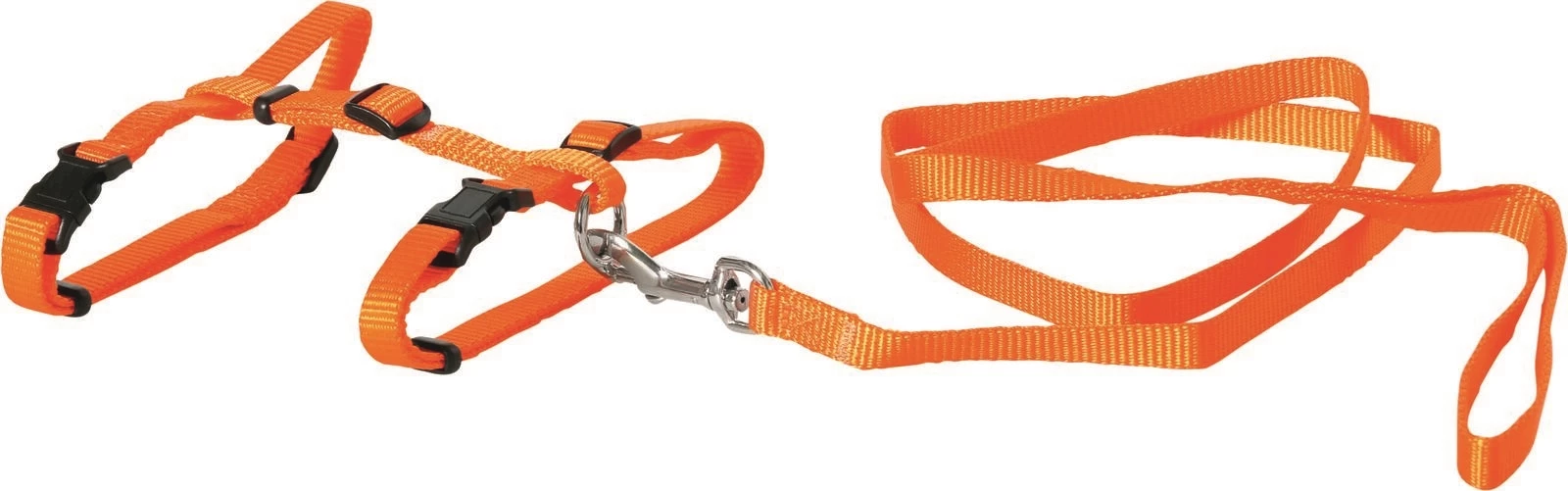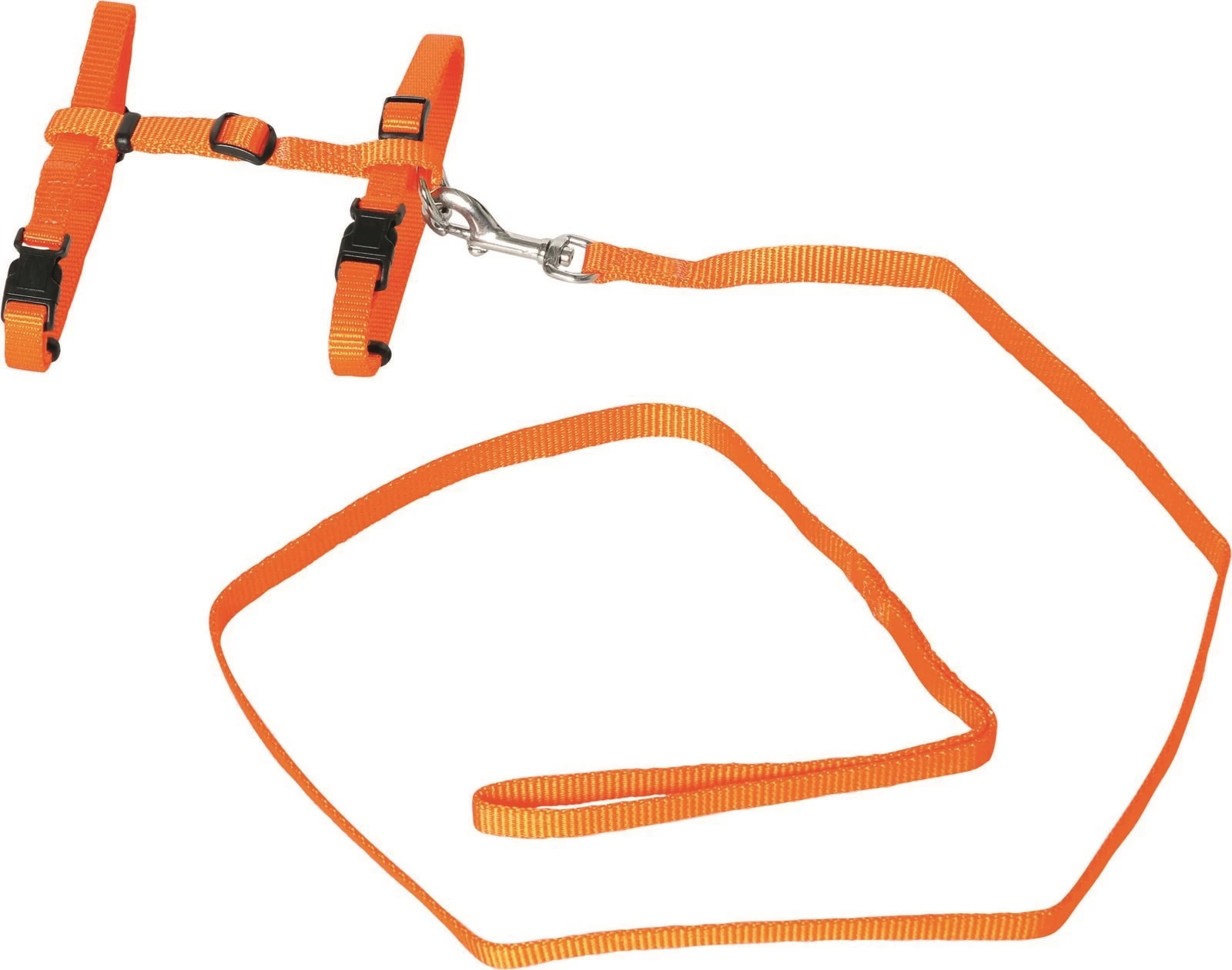 Geeignet für ausgewachsene Hauskatzen. Mit stufenlose verstellbaren Gurtbänder. Mit Schnappverschlüssen und passender Leine dazu. Länge Leine: 110 cm. Farbe: orange.