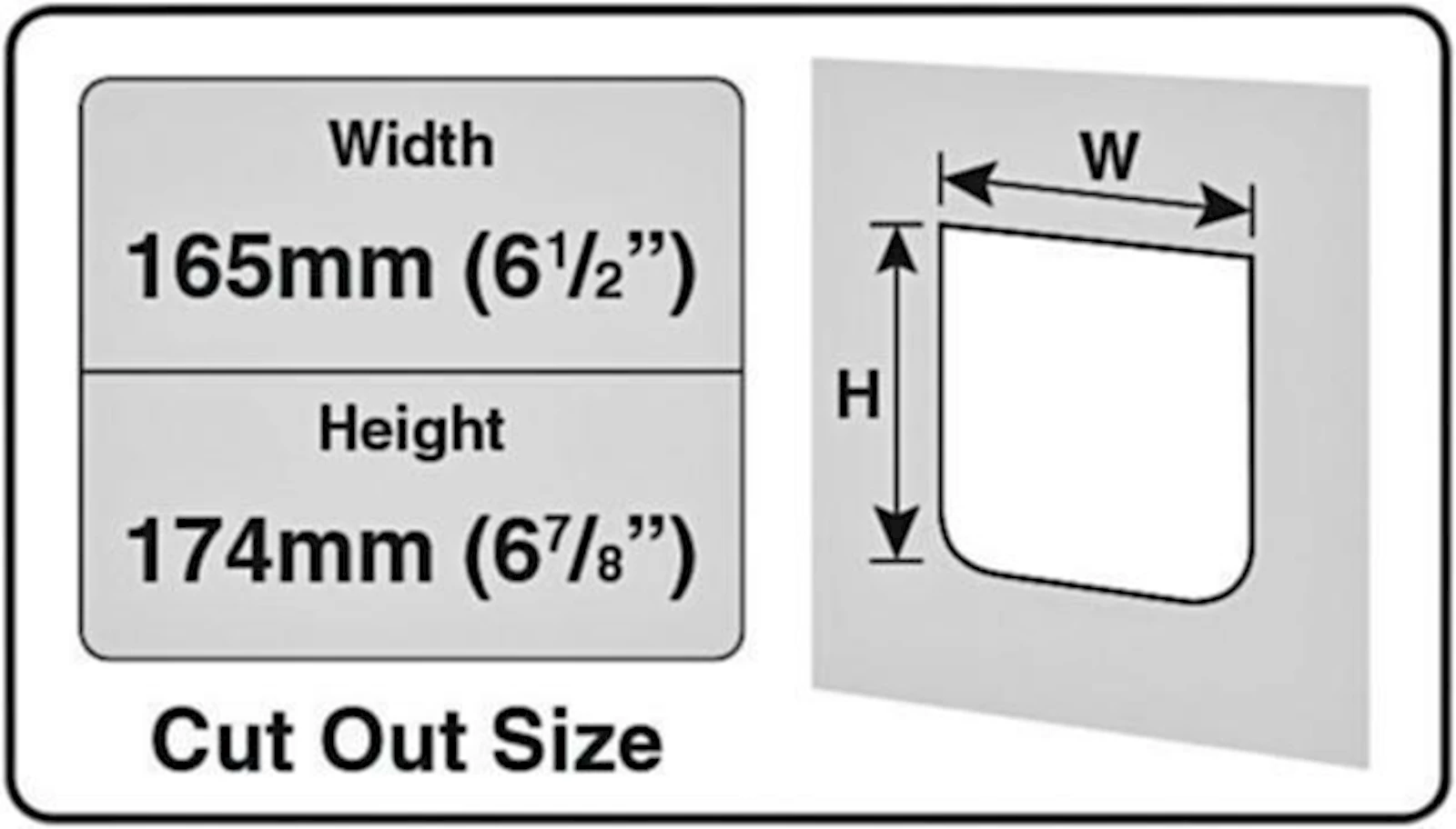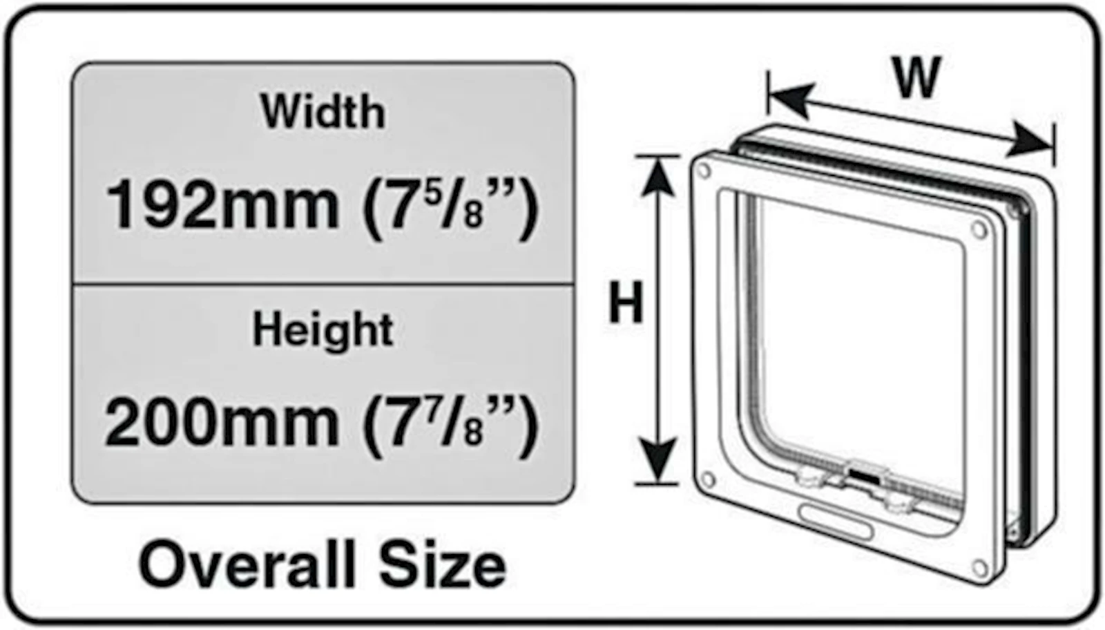 Für Türen mit dünnen Paneelen. Inkl. Schiebeverriegelung, Abdichtung und Magnetverschluss. Aussenmasse: 19,2 × 20 cm. Tür-Ausschnittmasse: 16,5 × 17,4 cm.