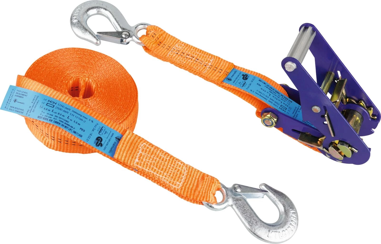Das orange Spannset aus Polyester eignet sich ausgezeichnet, um Lasten von bis zu 2500 kg zu befestigen oder zu sichern. Der Zurrgurt ist Temperaturbeständig von –40 °C bis +100 °C. Nach EN 1492-1 Norm geprüft.