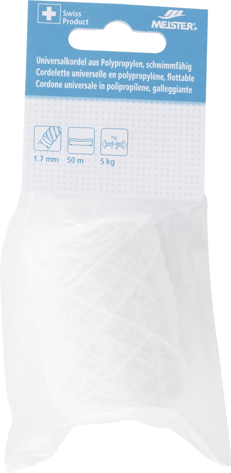 100 % Polypropylen. Schwimmfähig. Für den Innen- sowie Aussenbereich geeignet. UV-beständig. Länge: 50 m. Max. Nutzlast: 1 kg. Reisslast: 5 kg. Ø 1,7 mm. Swiss Made.