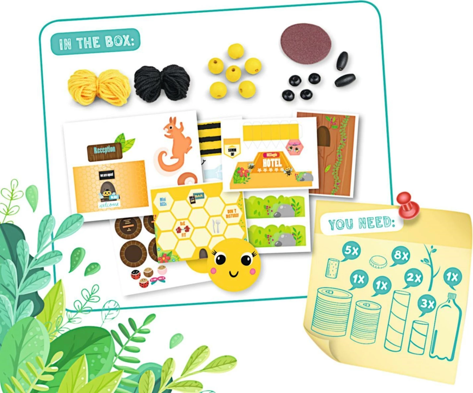 Ab 6 Jahren. Bastelset Air Bee n Bee aus recycelten Verpackungen. Mit Bastelmaterial, einer Bildanleitung und einem Storybook.