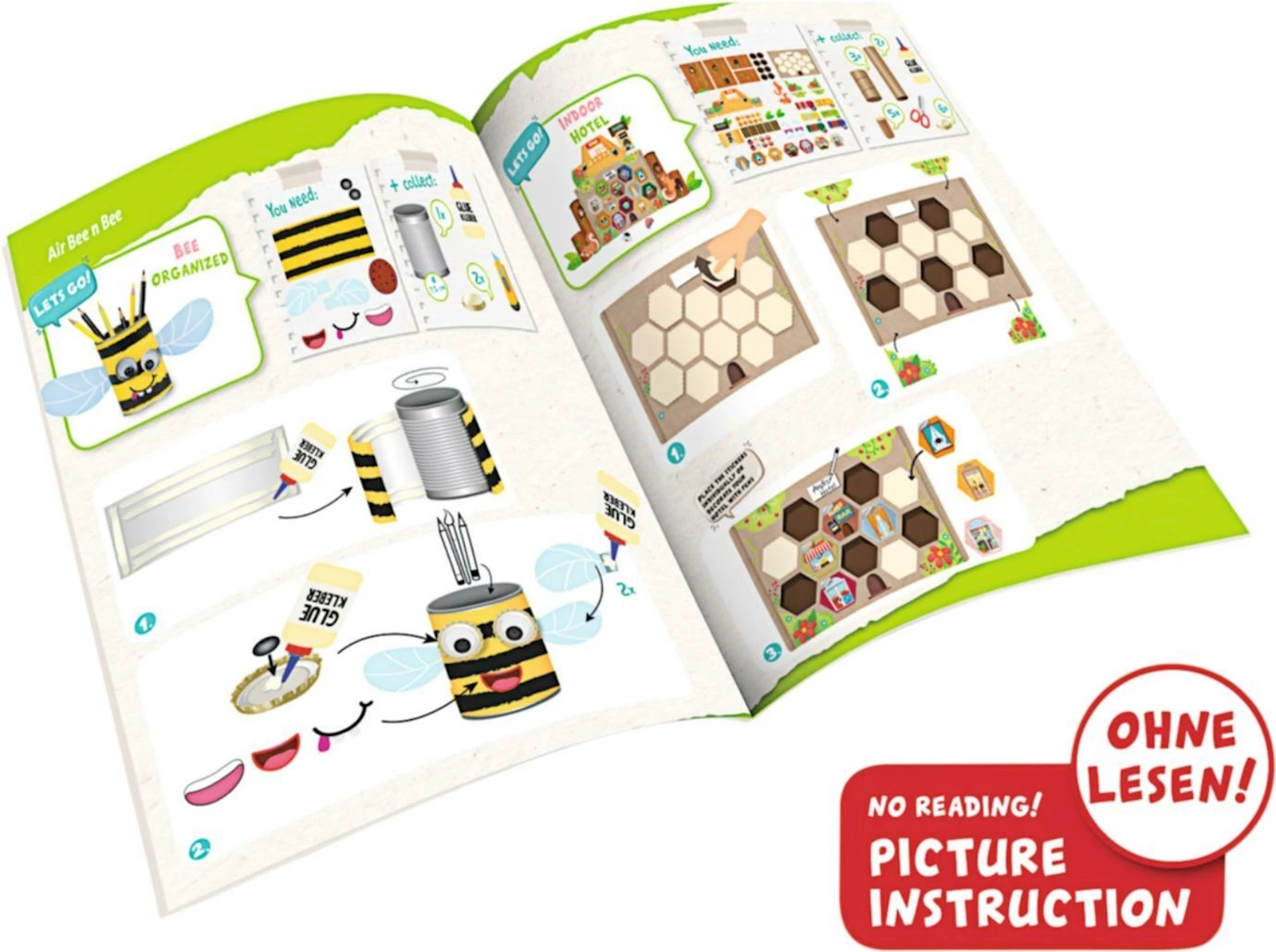 Mit dem nachhaltigen Bastelset Air Bee n Bee können Ihre Sprösslinge in eine fantasievolle Welt eintauchen. Aus recycelten Verpackungen entstehen mit ein wenig Aufwand und Spass wunderschöne DIY-Kunstwerke rund um das Thema Bienen. Dank der bildlichen und gut verständlichen Anleitung können Kinder die Anleitung auch ohne Lesen verstehen. So lassen sich im Nu aus haushaltsüblichen Utensilien und Wegwerfprodukten wie Büchsen, WC-Rollen, Flaschendeckeln usw. tolle Sachen basteln.