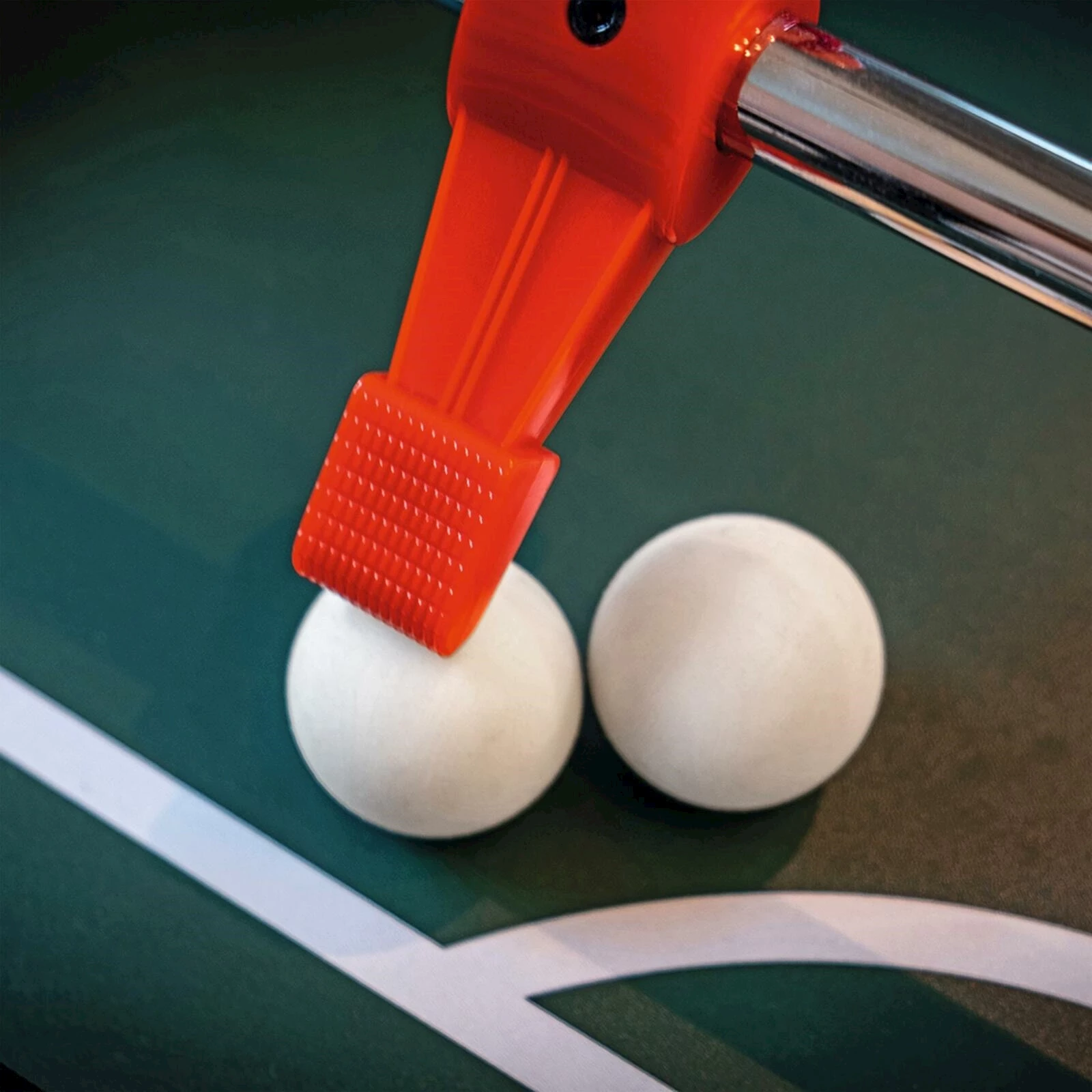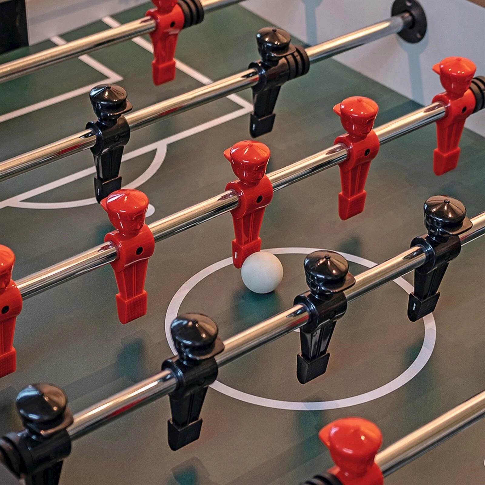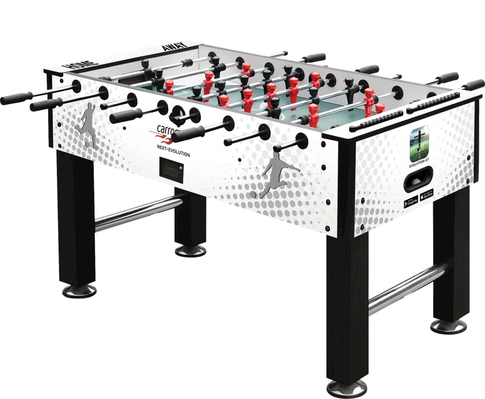 Dieser Fussballtisch ist das ideale Zubehör für alle Fussballfans. Mit dem Tisch ist der Spielespass garantiert und für Kinder ab acht Jahren geeignet. Die Spieler bestehen aus bruchsicherem Hartkunststoff und einer einzigartigen Fussstruktur um den Ball dicht an den Füssen zu halten. Er zeichnet sich durch seine robuste Bauweise, das integrierte Soundsystem und den Goalsensor aus. Zudem können mit der App Profile erstellt und am Ende des Spiels Statistiken verglichen werden. Da die professionellen, runden Handgriffe angenehm in der Hand liegen kann stundenweise damit gespielt werden. Das Bluetooth-Modul am Tisch wird mit 3 × AA Batterien betrieben, welche nicht im Set vorhanden sind und separat gekauft werden müssen. Im Set enthalten sind zwei griffige Fussbälle. Das Gesamtgewicht des Tisches beträgt 53 kg und er verfügt über folgende Masse 142 × 75 × 89 cm.