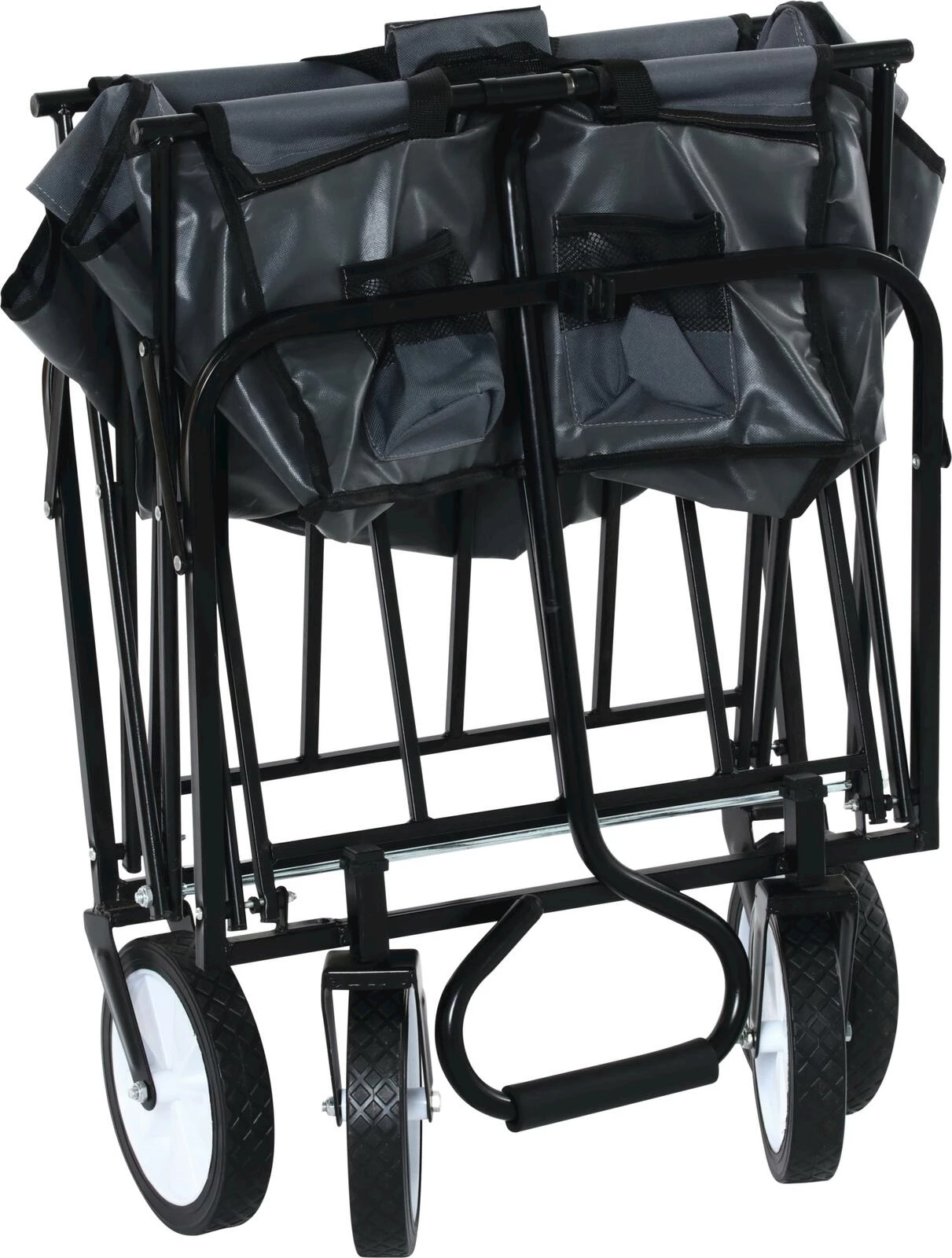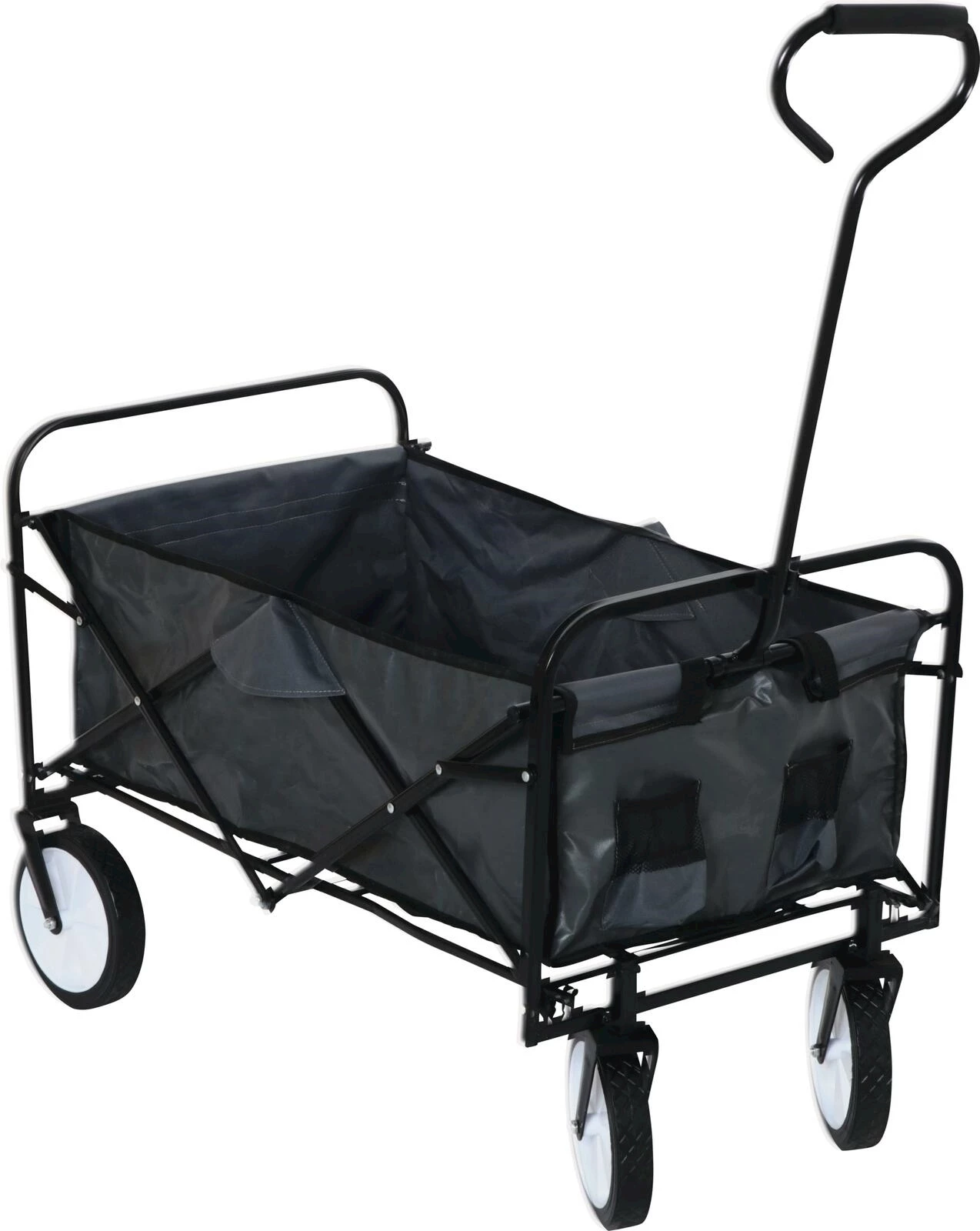 Einfach zu verstauender Bollerwagen für den Transport von Einkäufen, Gepäck, Gartenutensilien etc. Mit Schwenkrädern. Kapazität: 80 kg. Masse gefaltet/geöffnet: 19/100 × 53 × 73/113 cm.