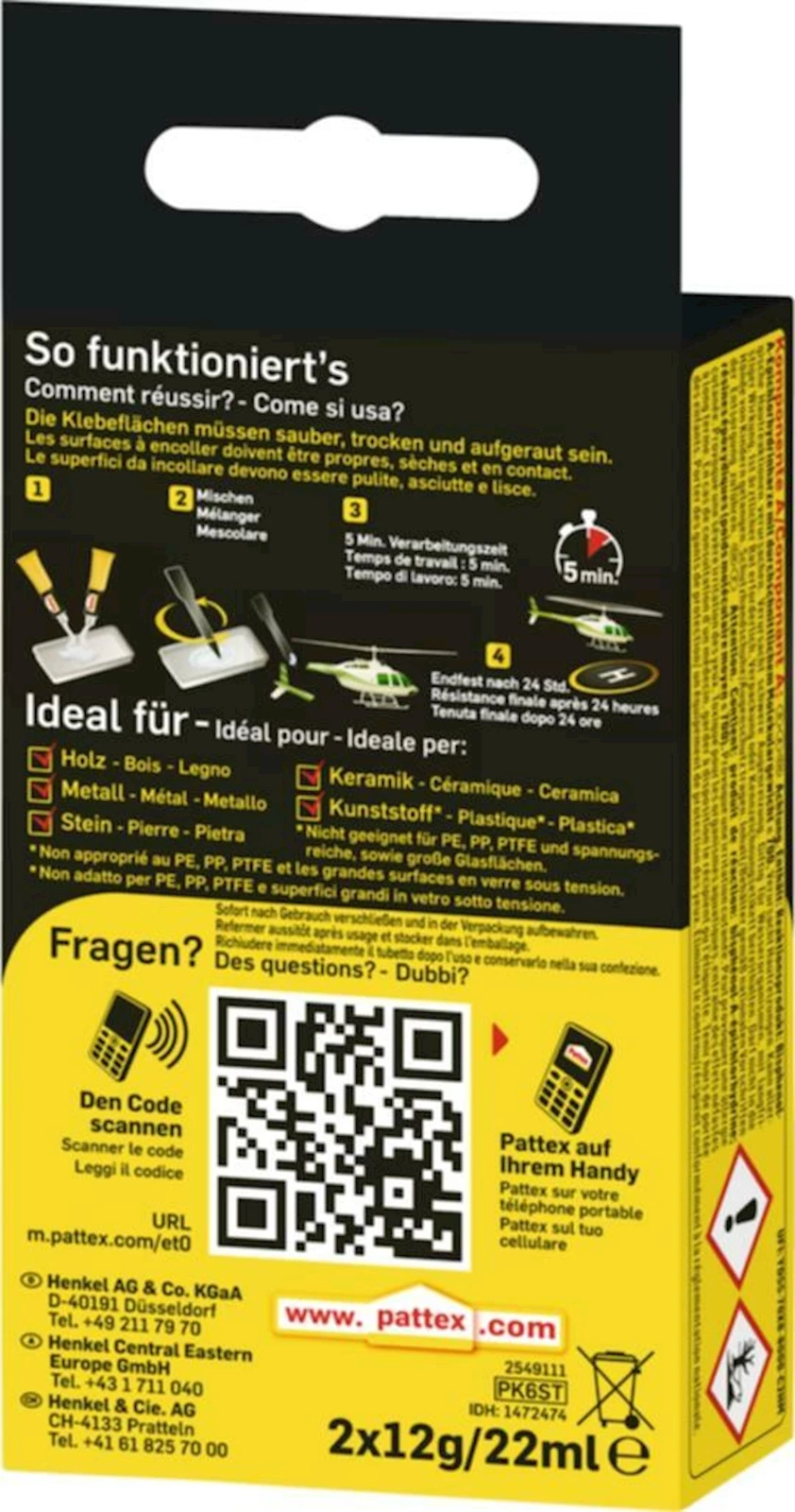 Vielseitig einsetzbarer Sofortkleber von Pattex für Keramik, Porzellan, Holz, Leder, Karton oder diverse Kunststoffe (z.B. ABS, Polystyrol, PVC-hart). Der Klebstoff ist ungeeignet für Polyethylen, Polypropylen und Teflon oder empfindliche Textilien. Wichtig: Vor dem Auftragen den zu klebenden Untergrund trocken und von Fett oder Staub befreien. Für mehr Festigkeit kann die Oberfläche vorgängig aufgeraut werden. Am besten kühl, aufrecht stehend lagern.