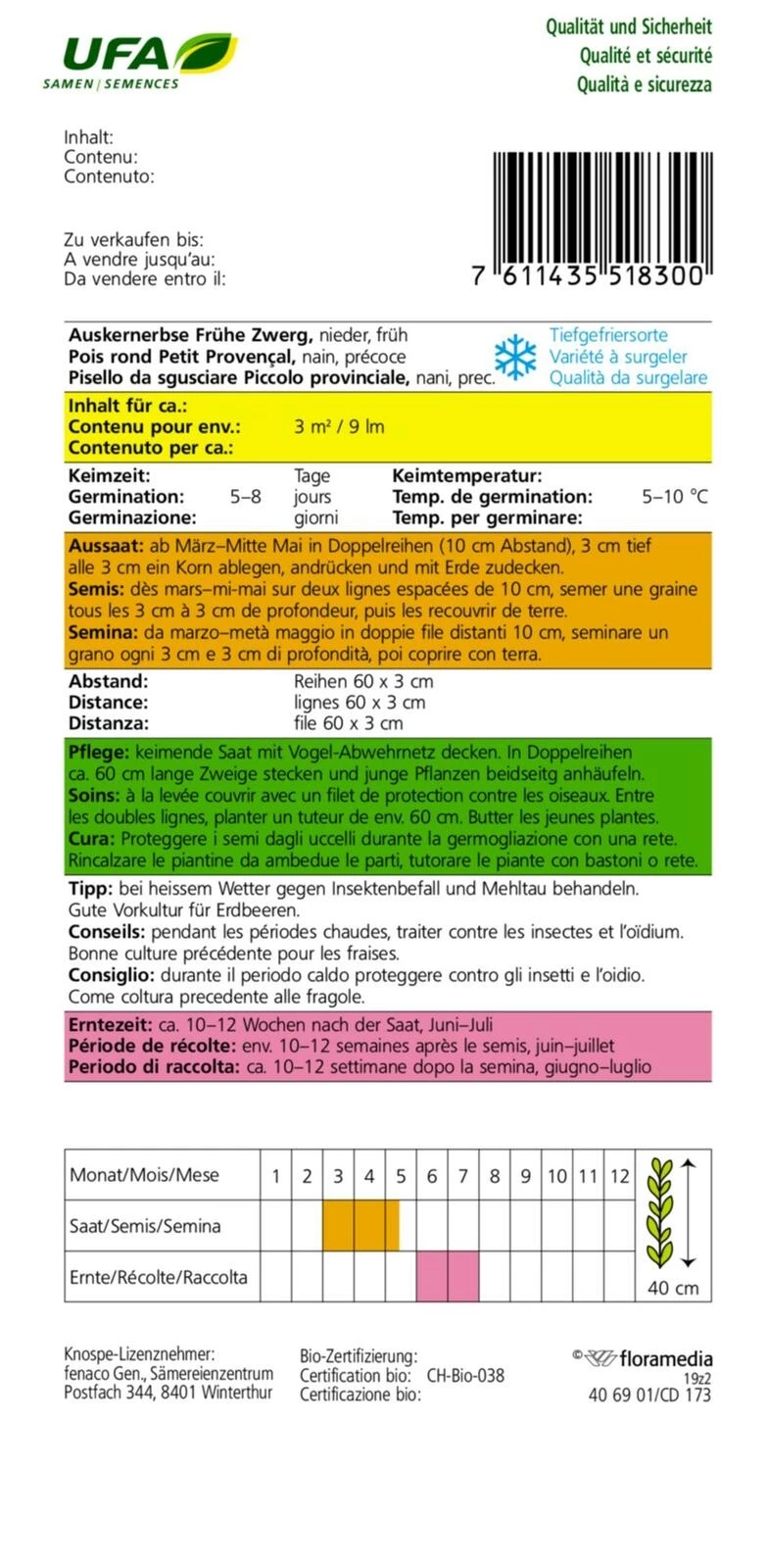 Die Sorte Früher Zwerg ist eine robuste, sehr frühe Markerbse mit süssen, zarten Körnern. Die kompakt wachsenden Pflanzen erreichen nur 40–50 cm Höhe und eignen sich besonders für kleinere Beete, Balkonkästen oder Kübel. Die Erbsen schmecken frisch verzehrt, aber auch gekocht oder tiefgefroren sehr gut.