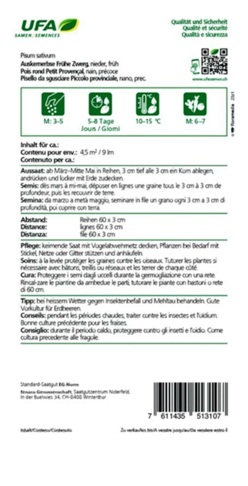 Die Sorte Früher Zwerg ist eine robuste, sehr frühe Markerbse mit süssen, zarten Körnern. Die kompakt wachsenden Pflanzen erreichen nur 40–50 cm Höhe und eignen sich besonders für kleinere Beete, Balkonkästen oder Kübel. Die Erbsen schmecken frisch verzehrt, aber auch gekocht oder tiefgefroren sehr gut.