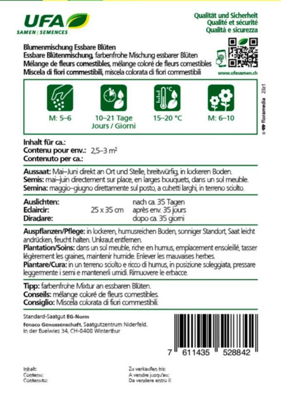 Diese Mischung von ein- und mehrjährigen Pflanzen ist ideal für Garten, Balkon oder Kübel. Sie bietet eine bunte Mischung aus Blütenpflanzen und Kräutern, die nicht nur optisch schön sind, sondern auch essbar sind. Viele der Pflanzen haben auffällige Blüten in Blau-, Gelb-, Rot- oder Weisstönen, während andere durch aromatische Blätter oder dekorative Fruchtstände auffallen. Die Pflanzen ziehen Bienen, Schmetterlinge und andere Nützlinge an und fördern so die Biodiversität im Garten.