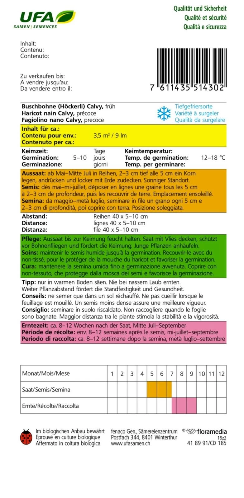 Bohnen sind frostempfindlich und sollten erst nach den Eisheiligen ins Freie gesät werden. Direktsaat ist üblich. Während der Keimung ist gleichmässige Feuchtigkeit entscheidend.