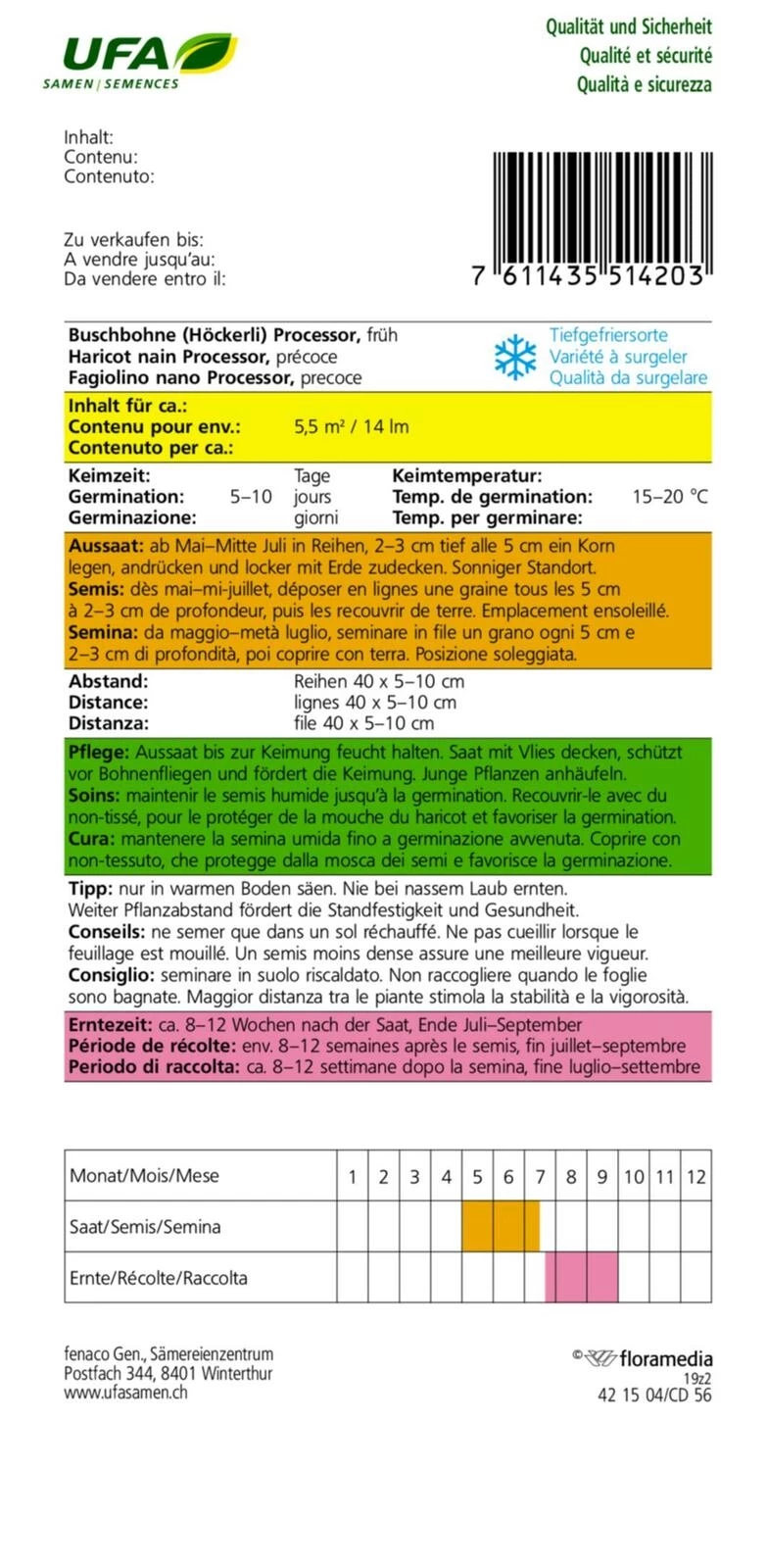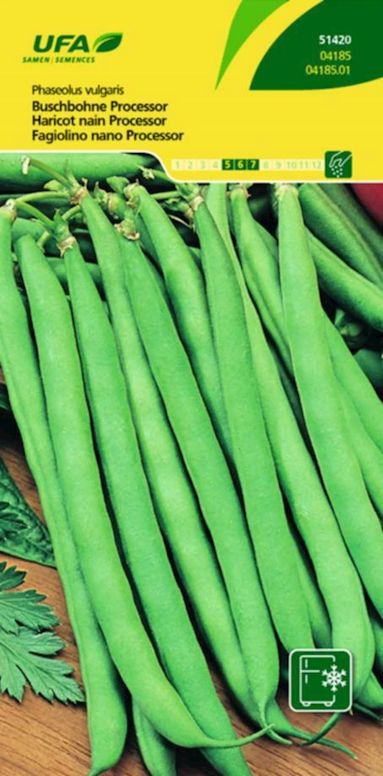 Die Processor ist eine robuste und ertragreiche Buschbohne mit aufrechtem, kräftigem Wuchs. Sie bildet zahlreiche, lange, fleischige und fadenlose Hülsen, die besonders zart und schmackhaft sind. Dank ihres feinen Aromas eignet sie sich hervorragend für frische Gemüsegerichte und zum Einfrieren. Die Pflanzen sind pflegeleicht und ideal für Beete, Hochbeete und den Hausgarten.