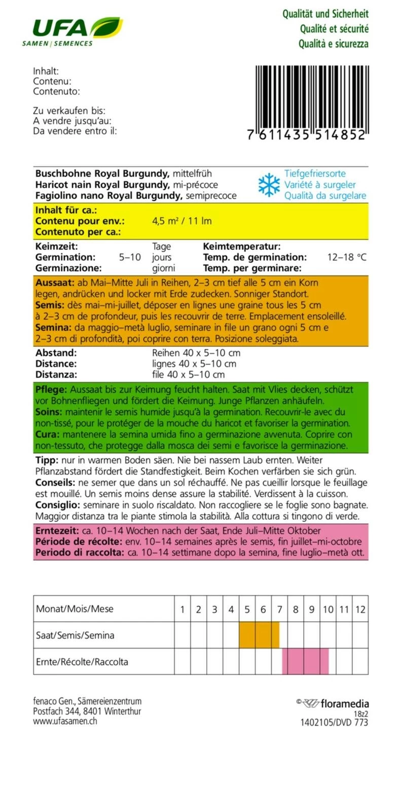 Die Royal Burgundy ist eine keimfreudige, mittelfrühe und robuste Sorte, die mit ihren dunkelvioletten Hülsen sofort ins Auge fällt. Durchs Kochen bekommt sie ein sattes Dunkelgrün. Die Pflanzen wachsen buschig, sind pflegeleicht und bringen einen guten Ertrag an zarten, schmackhaften Bohnen. Sie eignet sich hervorragend für Beete, Hochbeete und den Hausgarten.