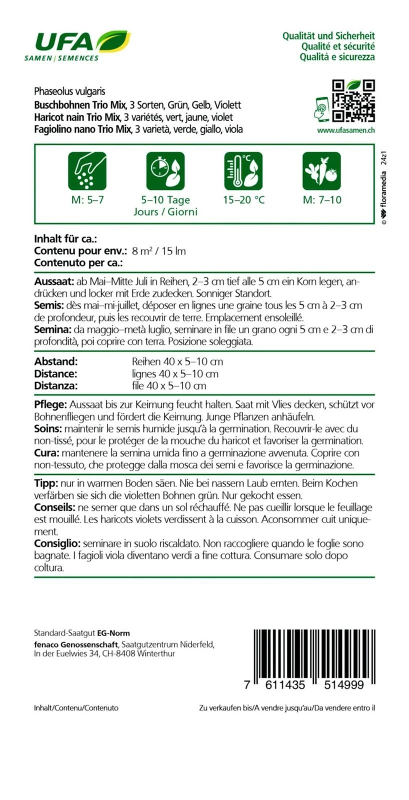 Der Buschbohnen Trio-Mix enthält drei verschiedene Bohnensorten mit grünen, gelben und violetten Hülsen. Diese farbenfrohen Bohnen sind nicht nur ein schöner Blickfang im Garten, sondern auch vielseitig in der Küche einsetzbar. Sie haben einen milden Geschmack und sind pflegeleicht. Besonders gut wachsen sie an warmen Standorten.