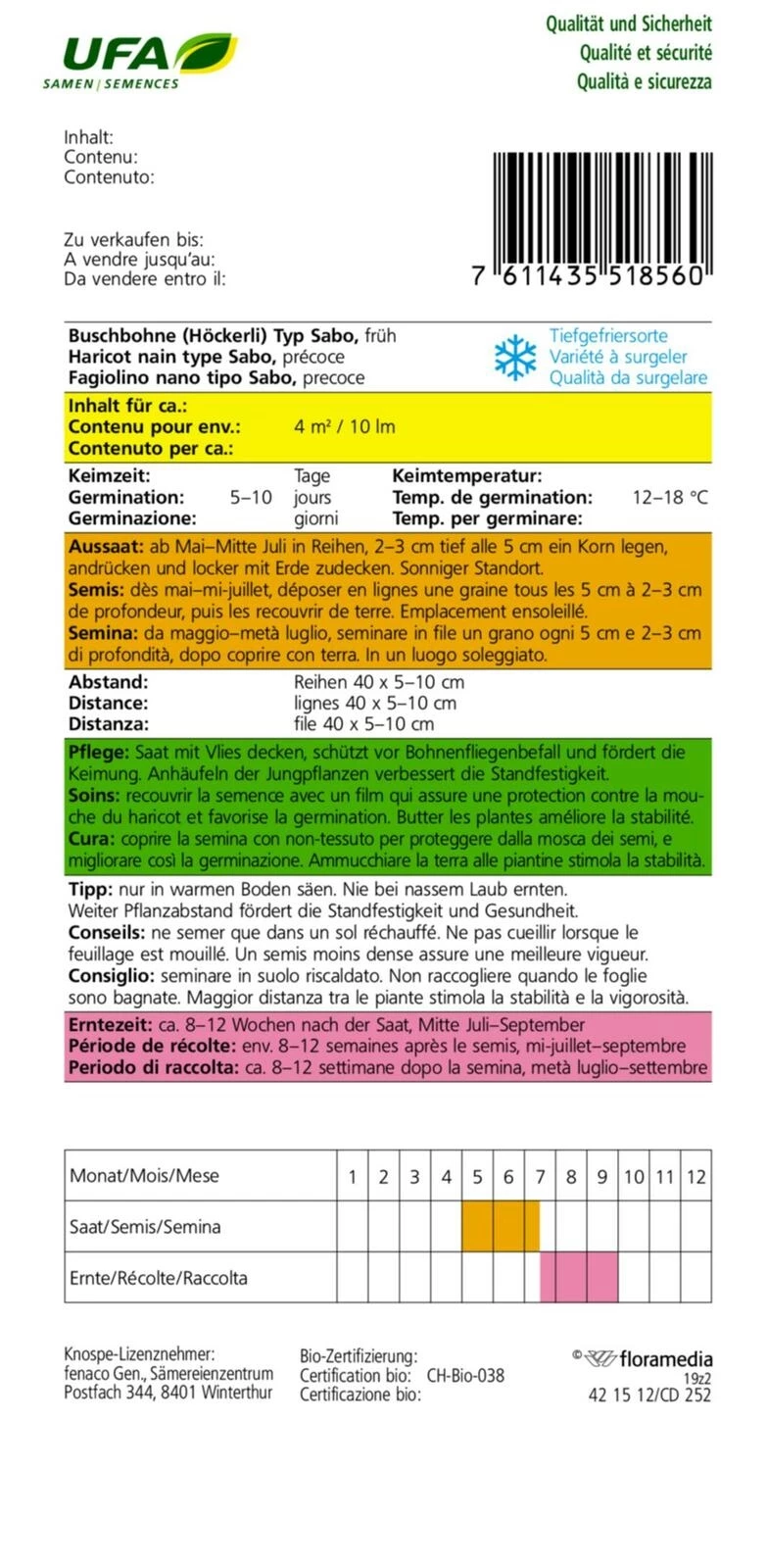 Die Typ Sabo BIO ist eine robuste, bewährte Buschbohne mit kräftigem, buschigem Wuchs. Sie bildet zahlreiche, gerade und fadenlose Hülsen, die zart, fleischig und aromatisch sind. Durch ihren feinen Geschmack eignet sie sich hervorragend für Gemüsegerichte, Bohnensalate und zum Einfrieren. Die Pflanzen sind pflegeleicht, ertragreich und bestens für Beete, Hochbeete und den Hausgarten geeignet. UFA 51856.
