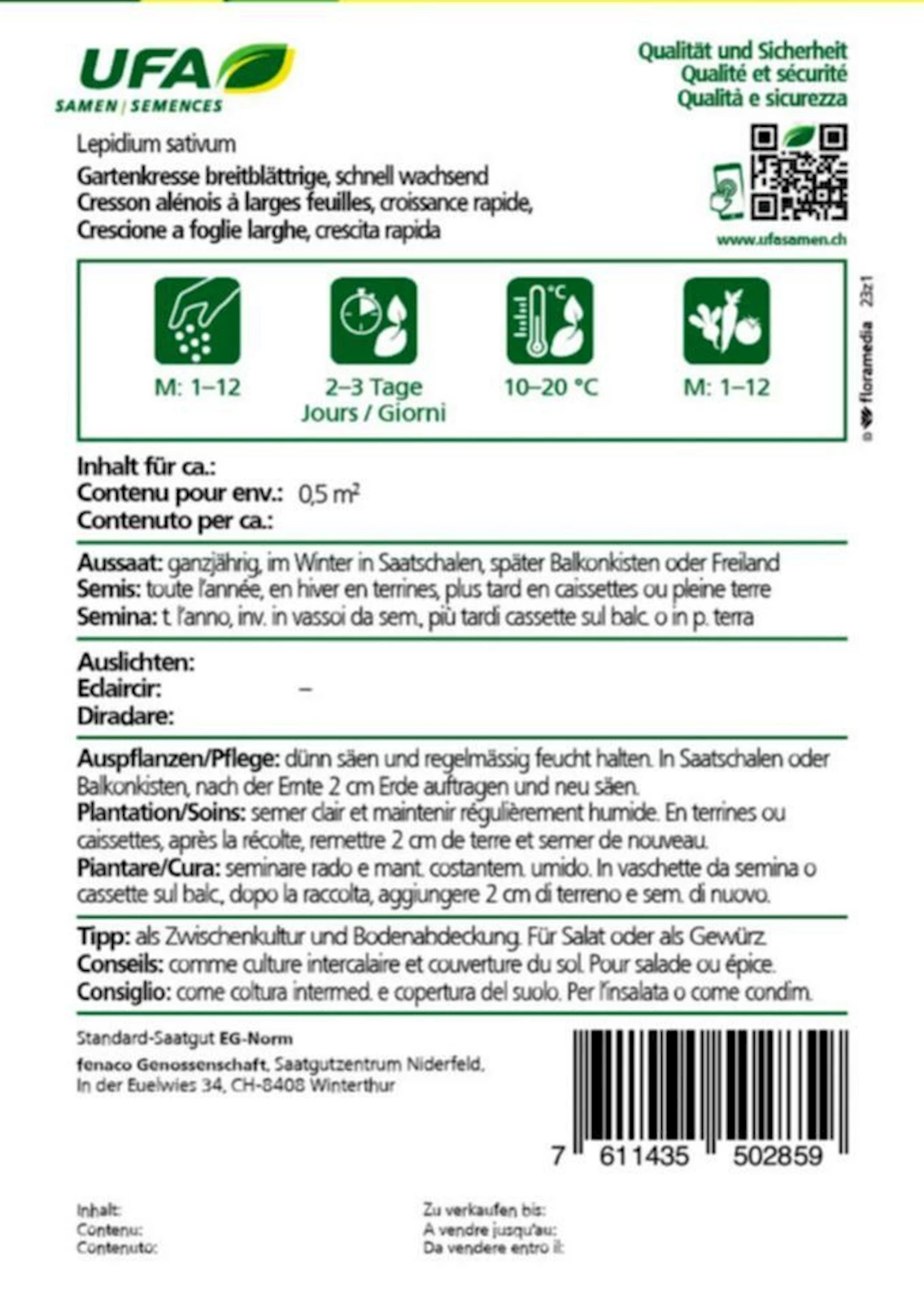 Aussaat möglich ab März bis August ins Freie. Gartenkresse keimt schnell bei 15–20 °C.