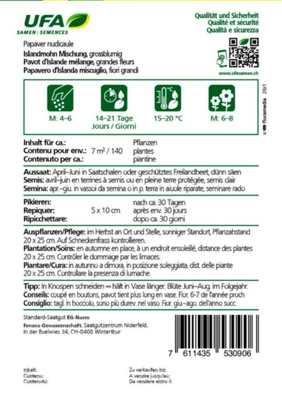 Auch Islandmohn genannt, blüht von Mai bis August in Gelb, Orange, Weiss oder Rot. Er wird 30–50 cm hoch und eignet sich für Beete und Steingärten.