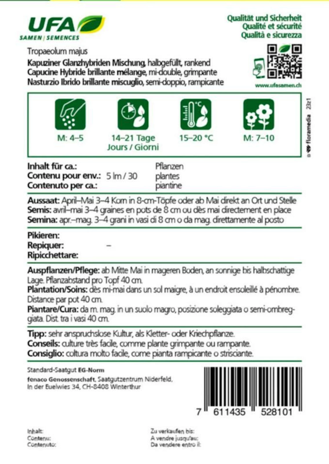 Tropaeolum majus ist frostempfindlich und wird in unseren Breiten einjährig kultiviert. Ins Freie pflanzen erst nach den Eisheiligen.