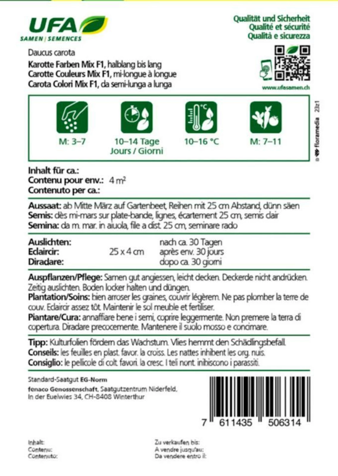 Die beste Erntezeit für den Karotten Farben Mix ist, wenn die Wurzeln eine gute Grösse erreicht haben, aber noch zart und knackig sind. Je nach Witterung und Bodenbedingungen können Karotten ab etwa 12 bis 16 Wochen nach der Aussaat geerntet werden. Um die Qualität der Wurzeln zu bewahren, sollten sie frisch verzehrt oder für eine längere Haltbarkeit im Kühlschrank aufbewahrt werden.