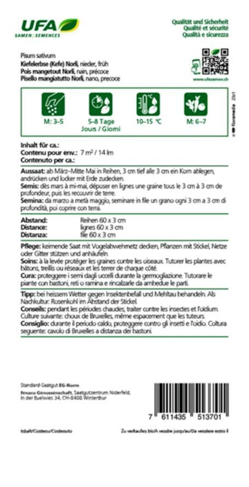 Die Kiefelerbse Norli ist eine frühe, ertragreiche Zuckererbse mit feinen, flachen Schoten, die jung geerntet besonders zart und süss schmecken. Die robusten Pflanzen erreichen 60–80 cm Höhe und eignen sich für Beete wie auch für Kübel. Die knackigen Schoten können frisch verzehrt oder kurz blanchiert verwendet werden.
