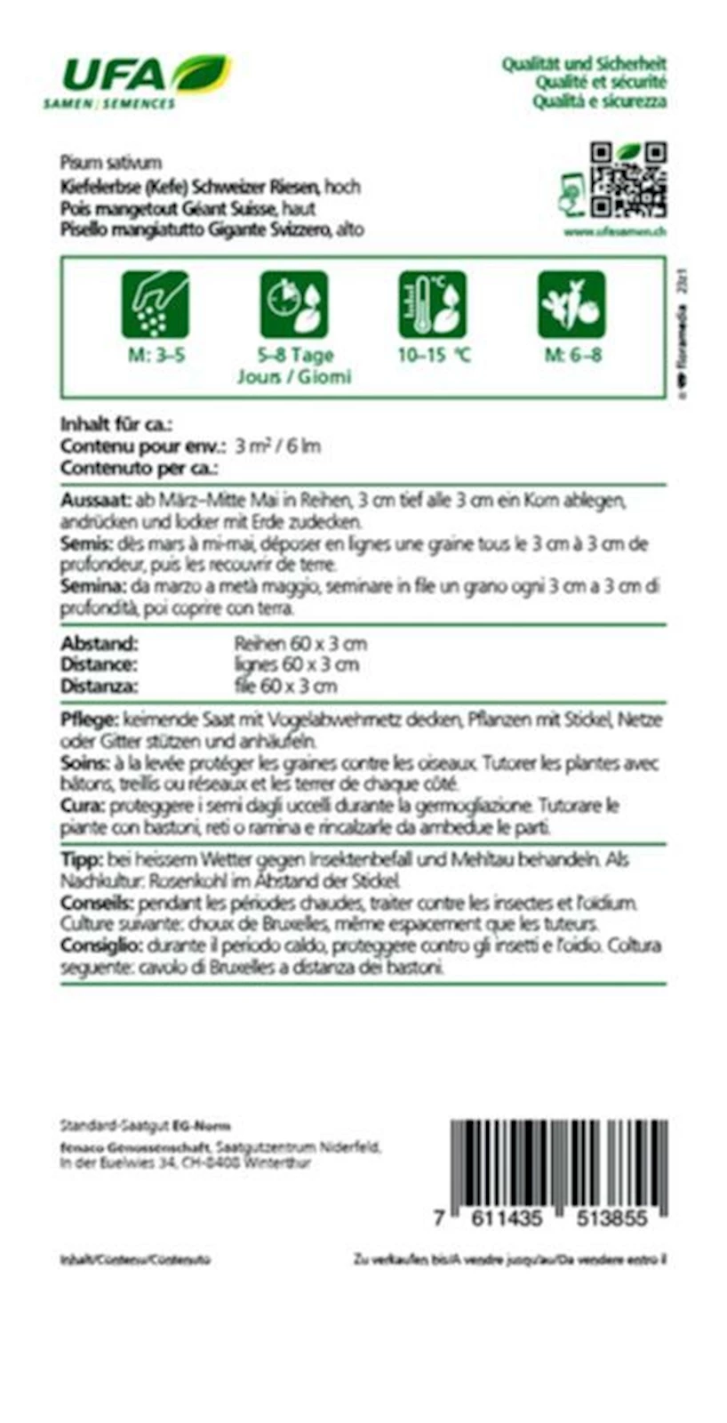 Die Sorte Schweizer Riese ist eine traditionelle, kräftig wachsende Zuckererbse mit besonders grossen, fleischigen Schoten. Sie erreichen jung geerntet eine feine Süsse und eignen sich sehr gut zum Frischverzehr, Blanchieren oder für die Küche. Die Pflanzen werden bis zu 150 cm hoch und benötigen eine Rankhilfe.