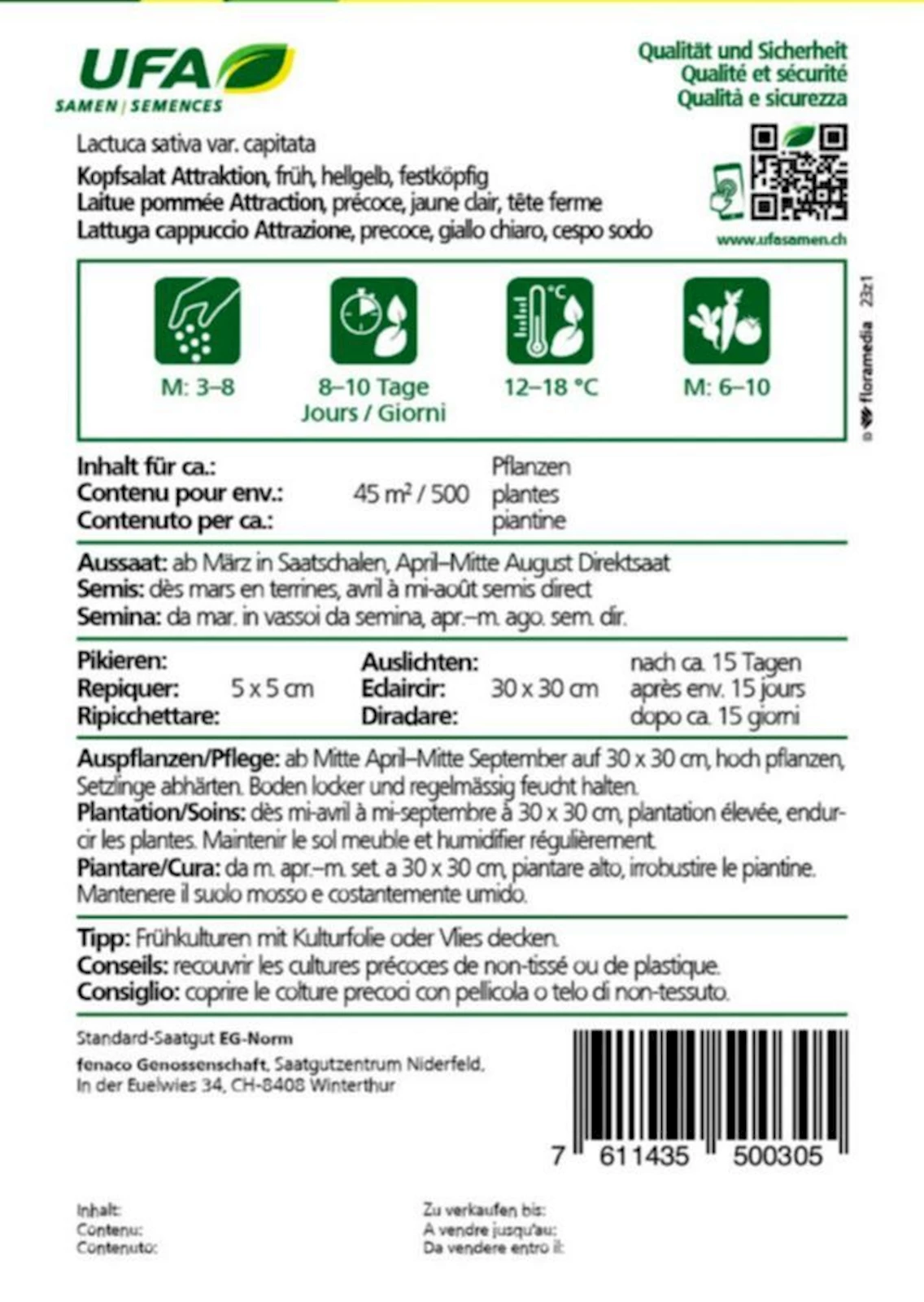 Kopfsalat Attraktion bevorzugt einen sonnigen bis halbschattigen Standort. Am besten wächst er in lockerer, humoser, nährstoffreicher Erde, die gleichmässig feucht gehalten wird. Staunässe vermeiden. Eine Grunddüngung mit Kompost oder organischem Dünger unterstützt gesundes Wachstum.