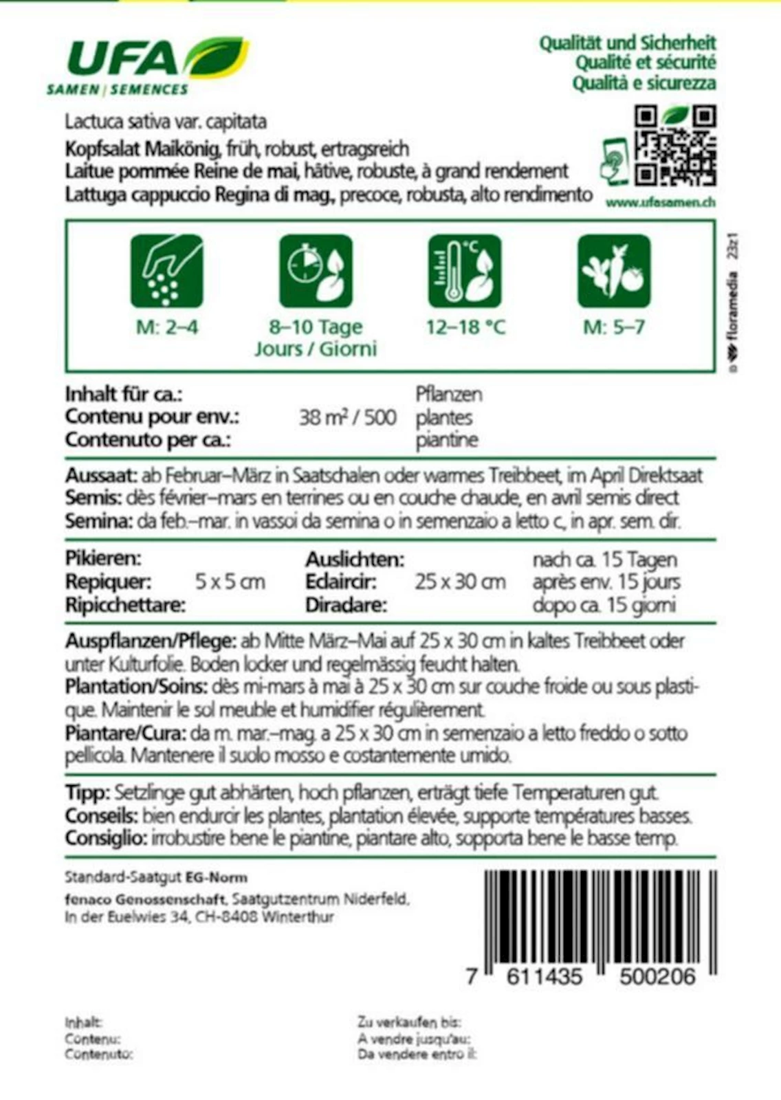 Lactuca sativa var. capitata ‘Maikönig’, auch als Kopfsalat Maikönig bekannt, ist eine frühe, bewährte Sorte. Sie bildet mittelgrosse, lockere, hellgrüne Köpfe mit zartem, mildem Aroma. Besonders beliebt als Frühlingssalat.
