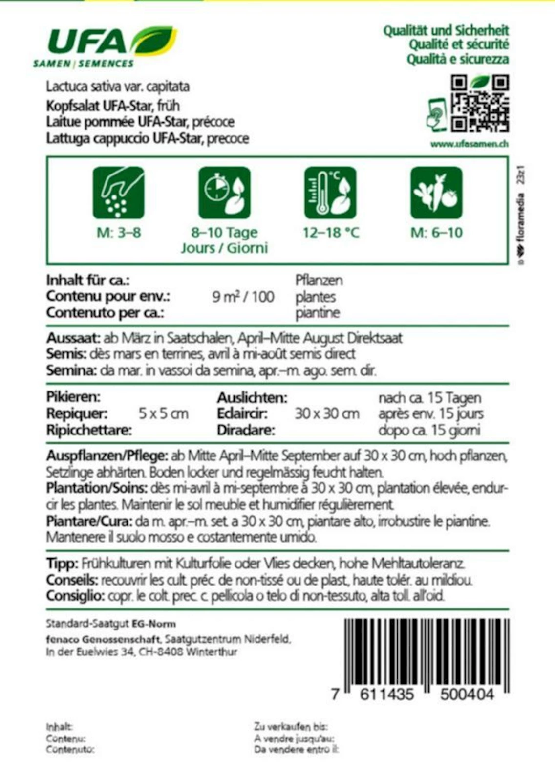 Lactuca sativa var. capitata ‘UFA-star’, auch als Kopfsalat UFA-star bekannt, ist eine bewährte, ertragreiche Sorte. Sie bildet mittelgrosse, feste, hellgrüne Köpfe mit zartem, mild-aromatischem Geschmack. Ideal für frische Salate oder als Beilage. UFA 50040.