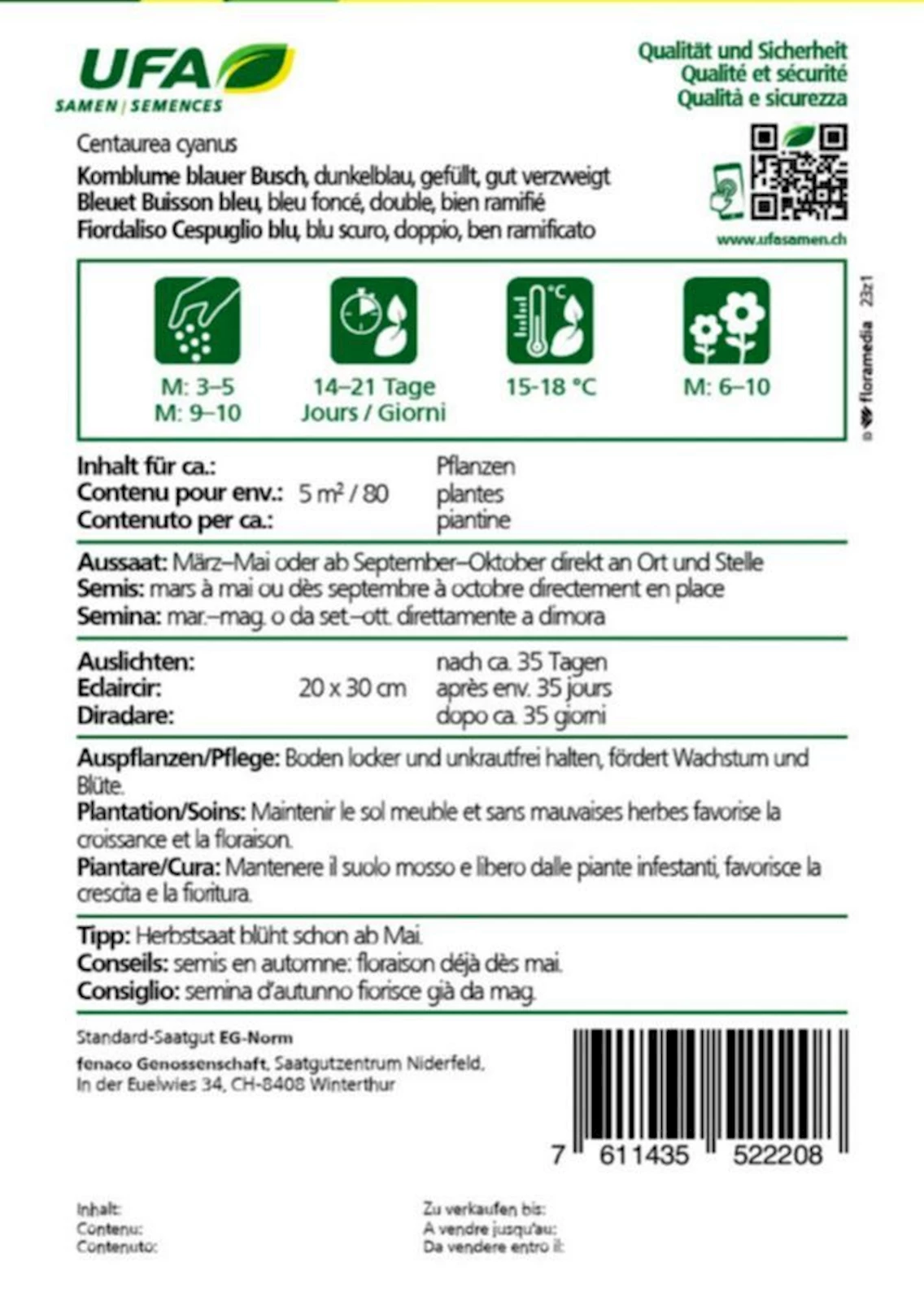 Die Kornblume lässt sich leicht aus Samen ziehen. Am besten sät man sie im Frühjahr direkt ins Freiland. Da sie Licht braucht, sollten die Samen nur leicht angedrückt und nicht bedeckt werden. Für eine lange Blütezeit empfiehlt sich eine regelmässige Aussaat. Sie passt gut in Wildblumenmischungen und sieht besonders schön neben Mohn, Kamille oder Gräsern aus.