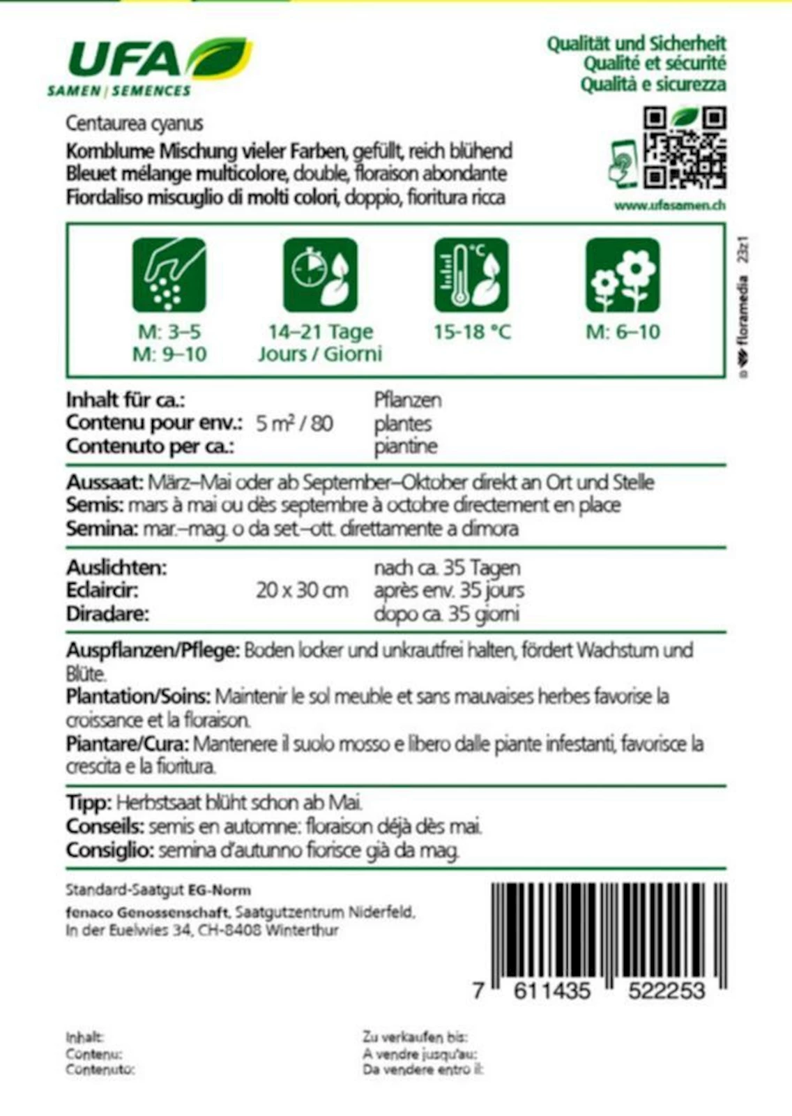 Die Kornblume (Centaurea cyanus) ist eine hübsche einjährige Pflanze mit leuchtend blauen Blüten, die auch in Lila, Rosa oder Weiss vorkommen kann. Ihre auffälligen Blüten ziehen Bienen und Schmetterlinge an. Sie blüht von Juni bis September und ist eine tolle Ergänzung für Sommerblumenbeete und Wiesen. Mit einer Höhe von 40 bis 90 cm passt sie gut in Blumenwiesen, naturnahe Beete oder Mischpflanzungen. UFA 52225