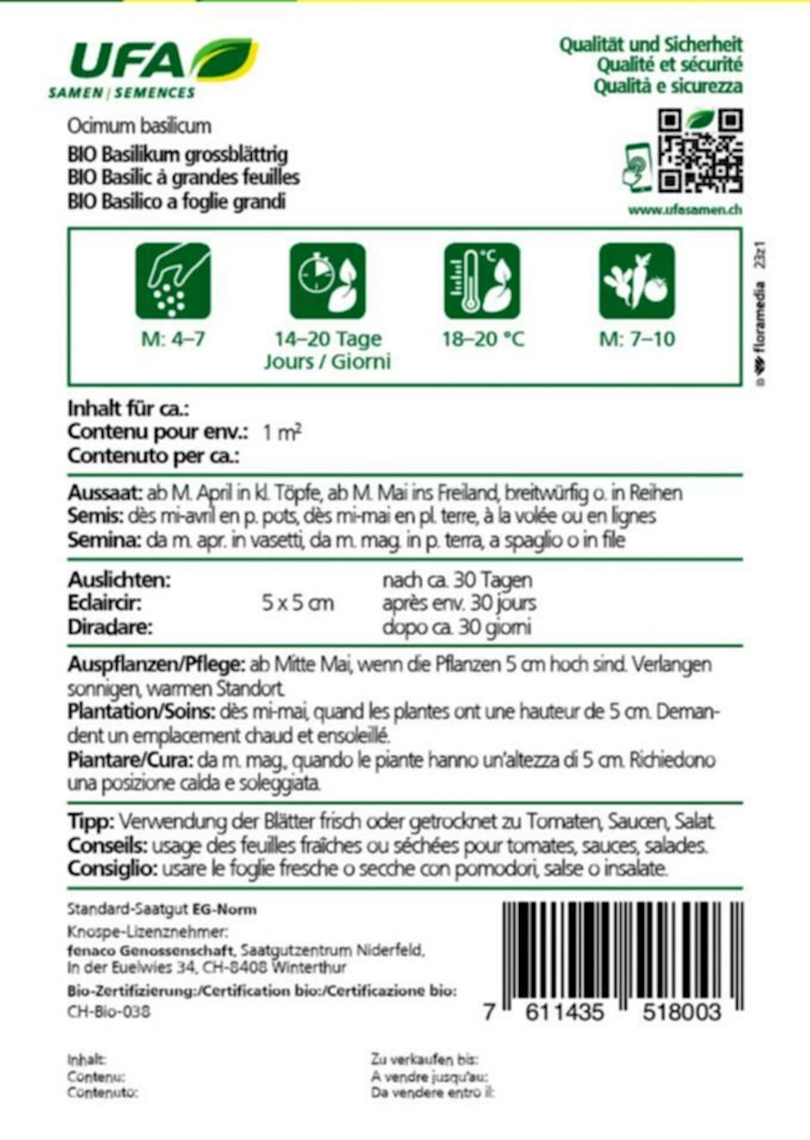 Ab Mitte Mai, nach den letzten Frösten, können Basilikumsamen direkt ins Freiland gesät werden. Eine Vorkultur ab März bis April im Haus ist ebenfalls möglich. Die Samen nur leicht mit Erde bedecken, da Basilikum ein Lichtkeimer ist. Erde feucht halten, aber Staunässe vermeiden. Eine Mulchschicht schützt vor Austrocknung.
