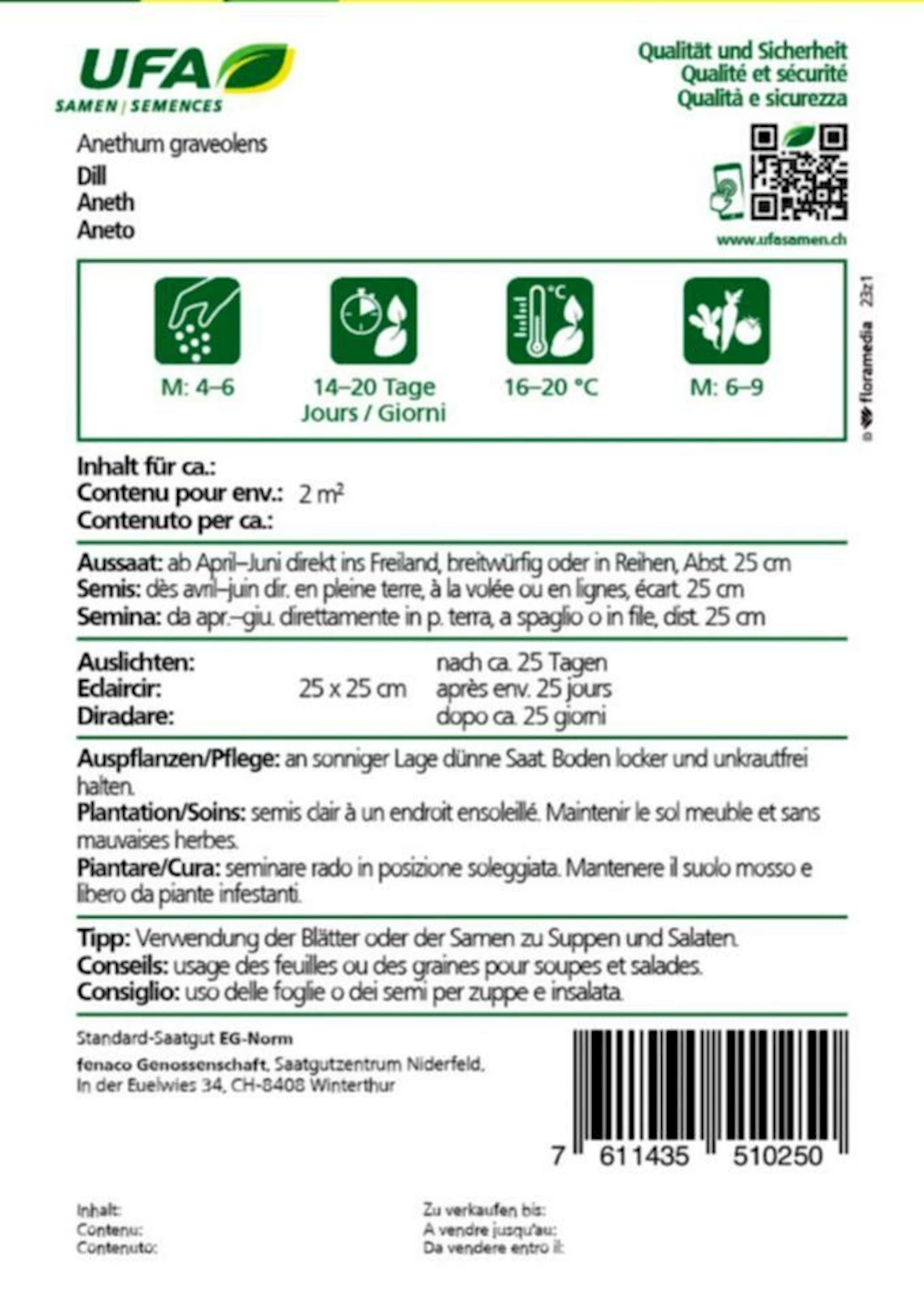 Ab April bis Juni direkt ins Freiland, breitwürfig oder in Reihen, Abstand 25 cm.