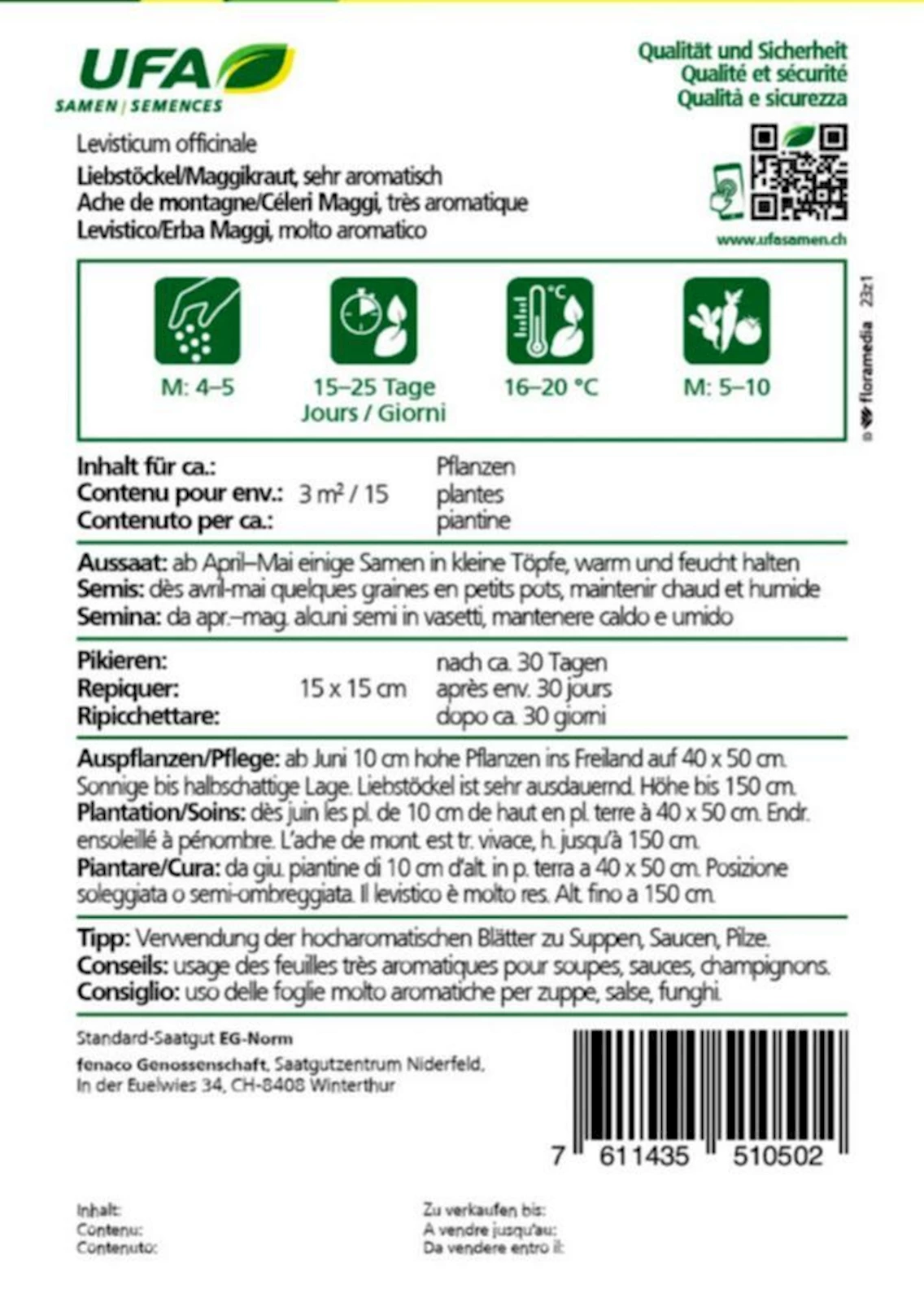 Auspflanzen ab Juni 10 cm hohe Pflanzen ins Freiland auf 40 × 50 cm. Sonnige bis halbschattige Lage. Liebstöckel ist sehr ausdauernd. Höhe bis 150 cm.