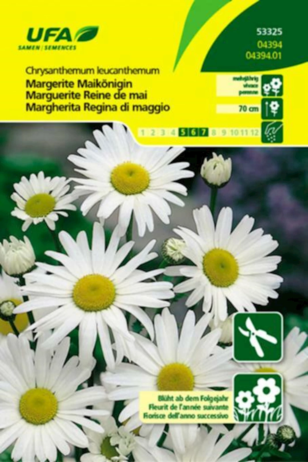 Chrysanthemum leucanthemum, auch als Margerite bekannt, ist eine mehrjährige, robuste Pflanze mit schmalen, grünen Blättern und charakteristischen, grossen, weissen Blüten mit gelbem Zentrum. Sie wächst aufrecht und erreicht eine Höhe von 50–90 cm, je nach Standort und Sorte. Die Margerite eignet sich hervorragend für Beete, Rabatten und Bauerngärten und zieht Bienen, Schmetterlinge sowie andere nützliche Insekten an.