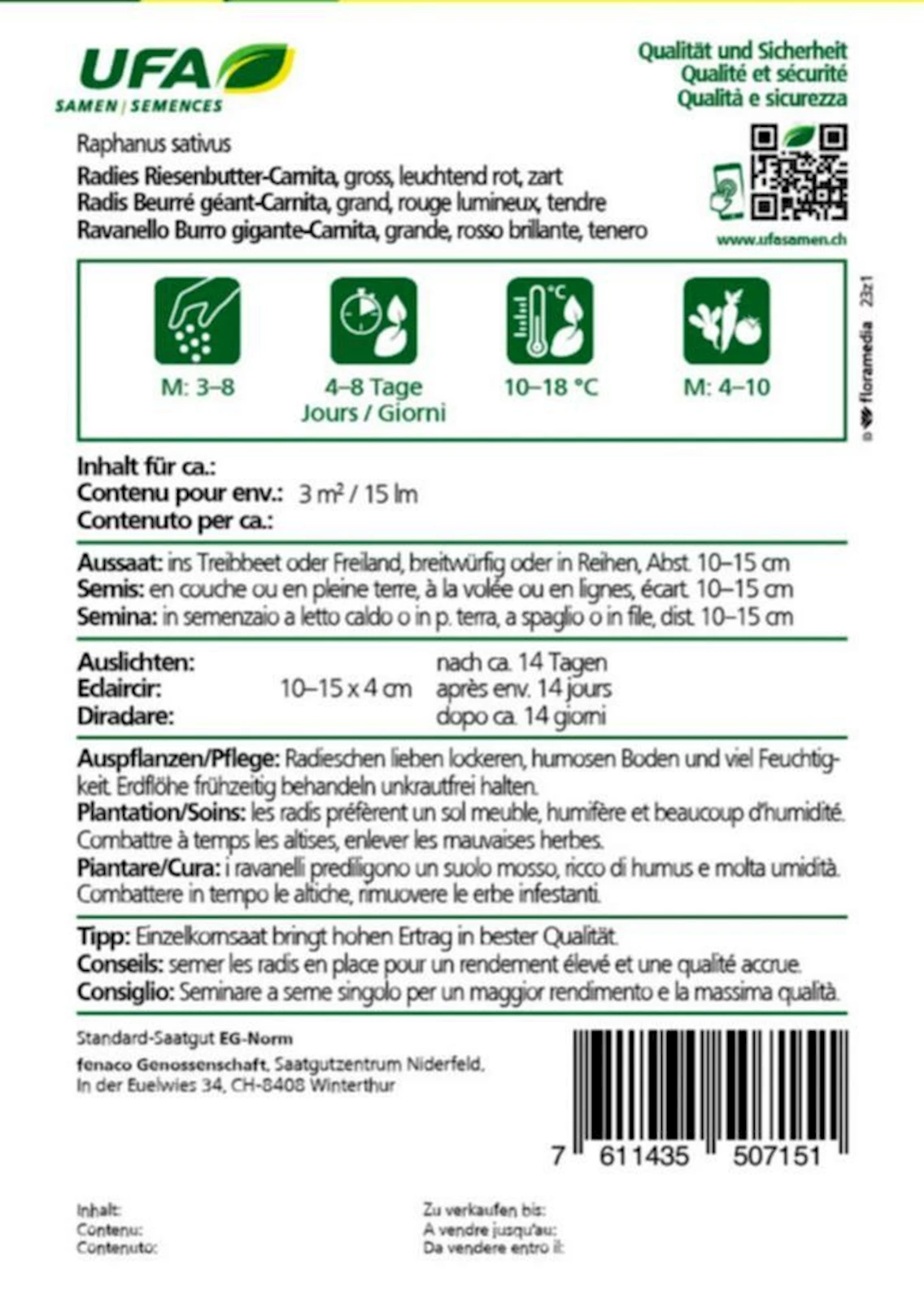 Radieschen sollten regelmässig und jung geerntet werden, da sie sonst pelzig oder holzig werden. Eine gleichmässige Wasserversorgung verbessert die Qualität. Mischkultur mit Salat oder Karotten ist günstig.