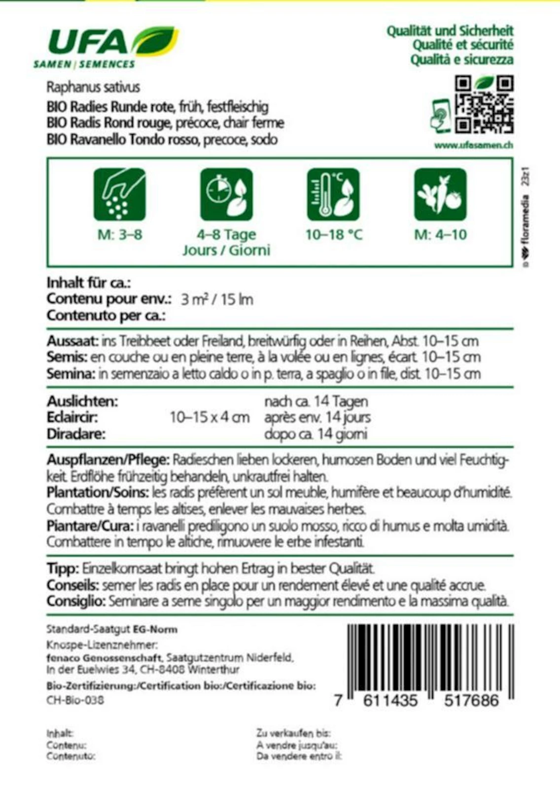 Radieschen bevorzugen sonnige bis halbschattige Standorte und lockeren, humosen Boden. Staunässe vermeiden. Sie sind pflegeleicht, wachsen rasch und können vom Frühjahr bis Herbst mehrfach ausgesät werden. Gleichmässiges Giessen sorgt für zarte, saftige Knollen.