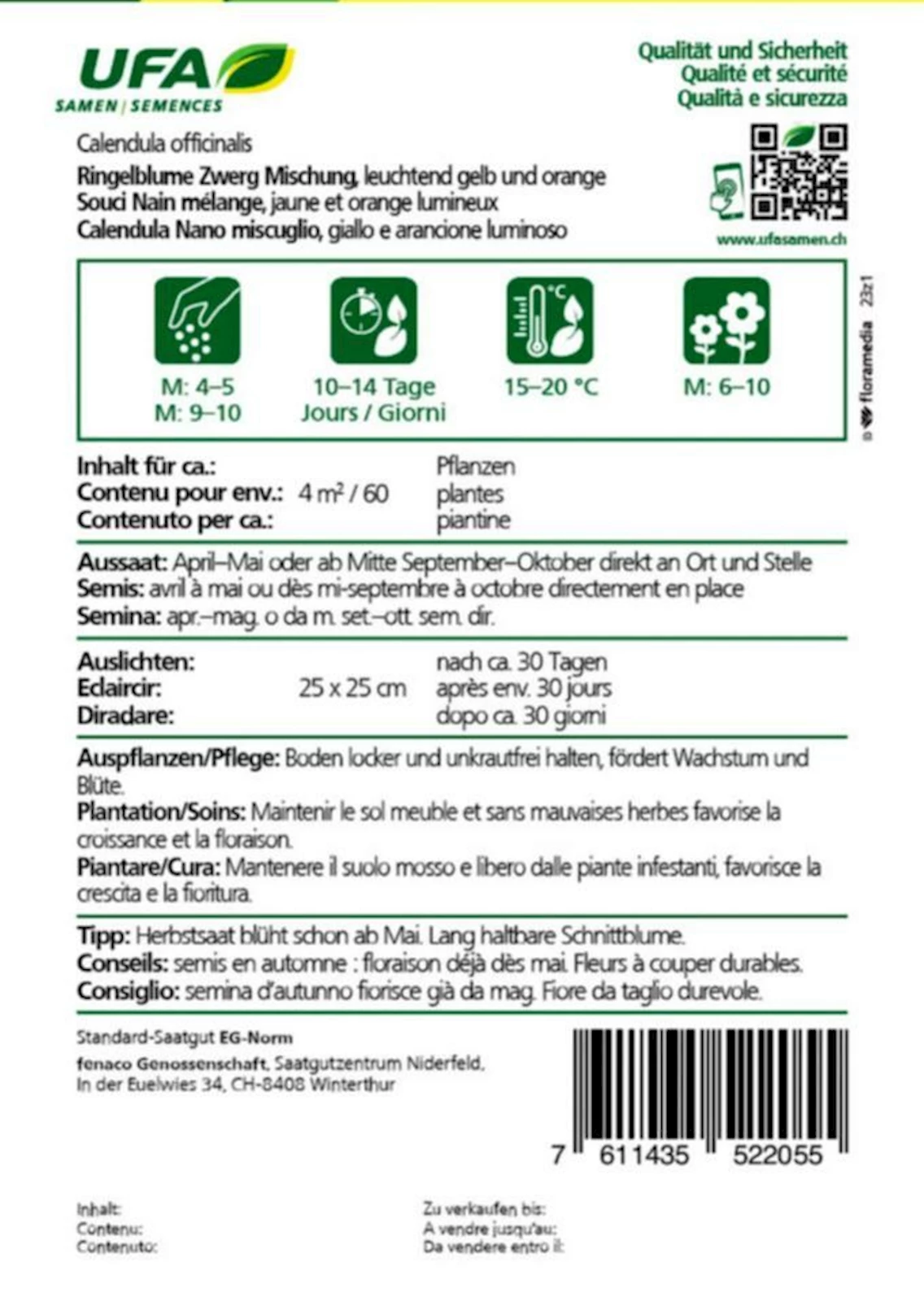Die Ringelblume Zwerg bevorzugt einen sonnigen Standort mit gut durchlässigem, nährstoffreichem Boden. Sie ist sehr robust und kommt auch mit wenig Wasser aus, wobei sie kurze Trockenperioden gut verträgt. Ein regelmässiger Rückschnitt fördert die Blüte und verhindert die Selbstaussaat.