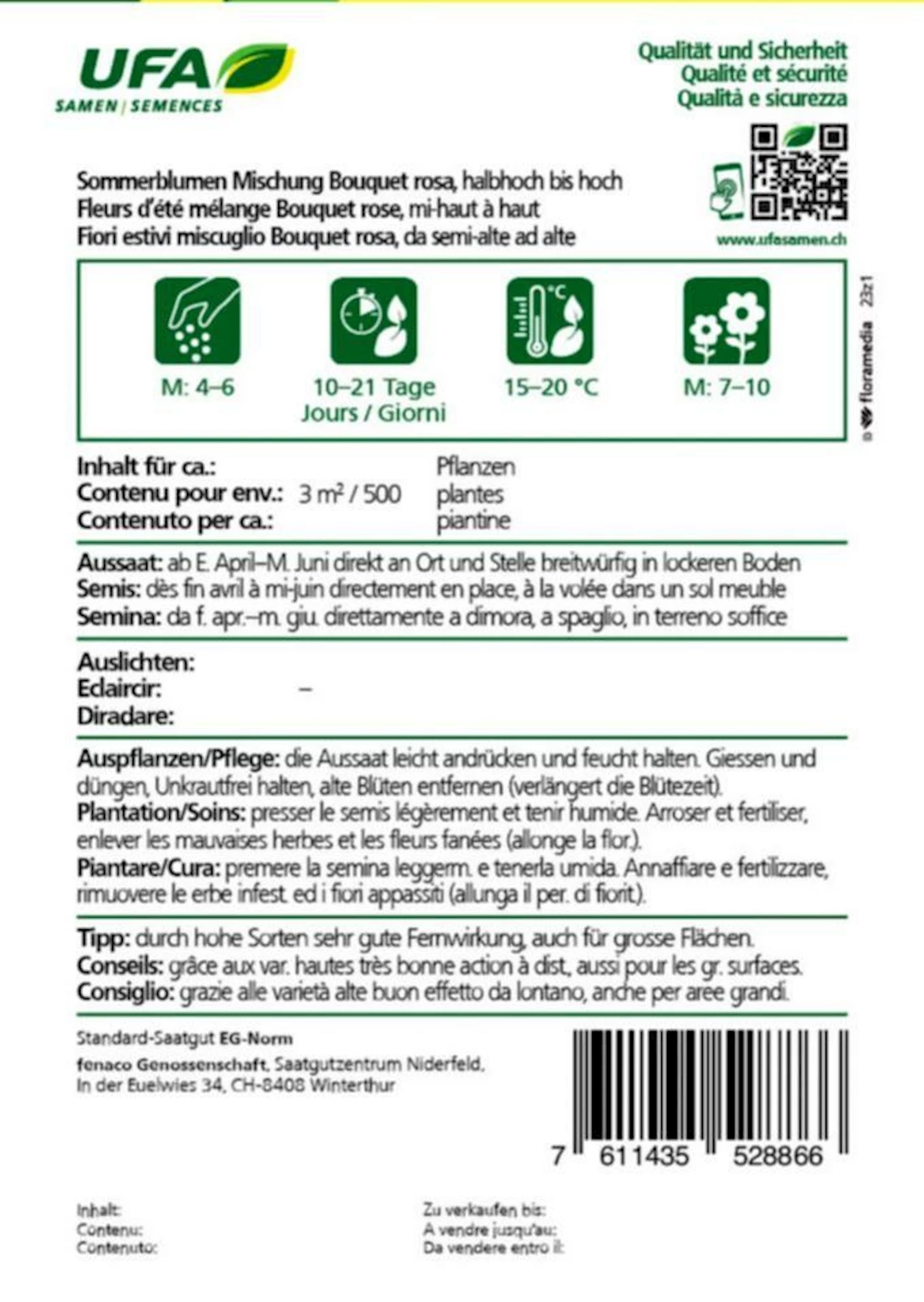 Die Sommerblumenmischung „Bouquet Rosa“ enthält einjährige Pflanzen, die alle rosa blühen. Sie verschönern Beete, Rabatten oder Kübel mit zarten Farbtönen. Ihre Blätter und Blüten ziehen Bienen und Schmetterlinge an und sorgen für eine schöne Atmosphäre im Garten.