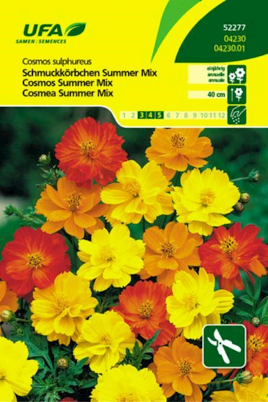 Die Cosmos sulphureus, auch als Schmuckkörbchen bekannt, ist eine einjährige Sommerblume mit fein gefiedertem Laub und leuchtend gelben oder orangen, strahlenförmigen Blüten. Sie erreicht je nach Sorte eine Höhe von etwa 60–120 cm und eignet sich hervorragend für Beete, Rabatten und als Schnittblume. Ihre Blüten ziehen Bienen, Hummeln und Schmetterlinge an.